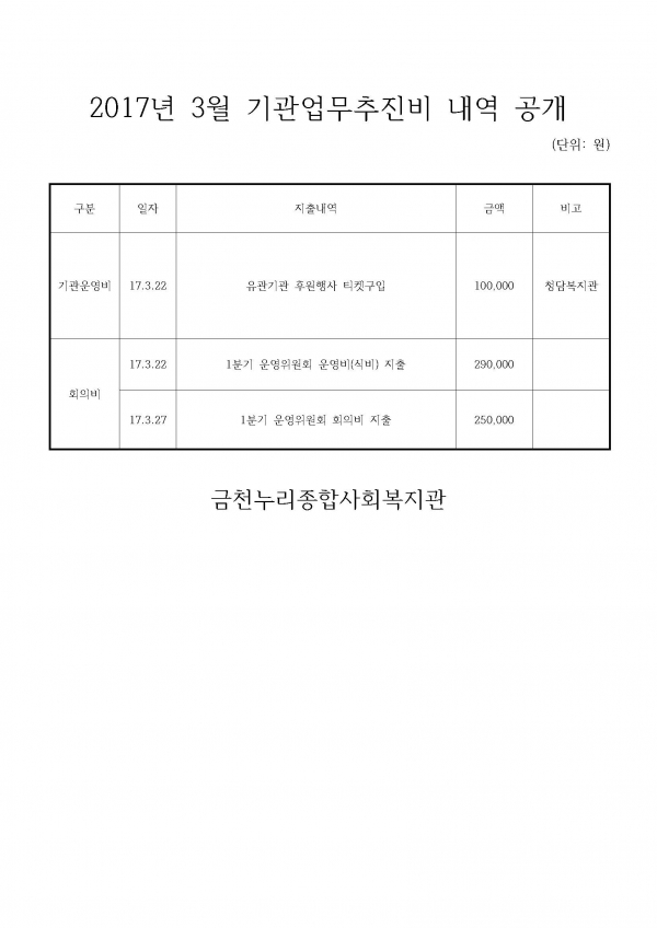 공지사항 프로그램 안내 이야기로 만나는 우리동네 영상으로 만나는 우리동네 미디어로 만나는 우리동네 사회복지사가 소개하는 우리동네 공지사항 예산 공시 | 2017년 3월 기관업무추진비 내역 공개 2017-04-06 관련링크 본문 이전글 다음글 수정 삭제 목록 2025년 하반기 2025년 상반기 2024년 하반기 2024년 상반기 2023년 하반기 X 개인정보처리방침 금천누리종합사회복지관 개인정보취급방침 금천누리종합사회복지관(이하 “복지관”이라 함)이 취급하는 모든 개인정보는 관련법령에 근거하거나 정보주체의 동의에 의하여 수집 · 보유와 처리되고 있습니다. 복지관 개인정보처리방침은 「개인정보 보호법」 에 근거를 두고 있으며, 이러한 법령의 규정에 따라 수집 · 보유와 처리하는 개인정보를 공공업무의 적절한 수행과 국민의 권익을 보호하기 위해 적법하고 적정하게 취급할 것입니다. 또한, 복지관은 관련 법령에서 규정한 바에 따라 보유하고 있는 개인정보에 대한 열람청구권과 정정청구권 등 여러분의 권익을 존중하며, 이와 관련한 고충을 신속하고 원활하게 처리할 수 있도록 하기 위하여 다음과 같이 개인정보처리방침을 수립 · 공개합니다. 제1조(개인정보의 처리목적) 복지관은 다음의 목적을 위하여 개인정보를 처리합니다. 처리하고 있는 개인정보는 다음의 목적 이외의 용도로는 이용되지 않으며, 이용목적이 변경될 경우에는 개인정보보호법 제18조에 따라 별도의 동의를 받는 등 필요한 조치를 이행할 예정입니다. 1. 자원봉사 신청 및 자원봉사자 관리 자원봉사 의사 확인, 봉사활동 실시를 위한 자원봉사자의 교육, 사회복지봉사활동인증관리시스템(VMS) 실적입력, 배치신청, 증명서 발급, 소식지 발송, 만 14세 미만 아동의 개인정보 수집 이용 시 법정대리인의 동의여부 확인, 각종 고지·통지, 고충처리, 통계자료 작성 등을 목적으로 개인정보를 처리합니다. 2. 후원 신청 및 후원자 관리 후원과 관련된 기본적인 본인 식별, 기부금 출금, 기부금영수증 발급과 국세청 연말정산간소화서비스로의 정보제공, CMS 신규/해지와 출금요청을 위한 정보제공(금융결제원), 만 14세 미만 아동의 개인정보 수집 이용 시 법정대리인의 동의여부 확인, 각종 고지·통지, 고충처리, 통계자료 작성 등을 목적으로 개인정보를 처리합니다. 3. 시설대관 및 기관방문 업무 운영과 관리 등을 목적으로 개인정보를 처리합니다. 제2조(개인정보의 처리와 보유기간) ① 복지관 법령에 따른 개인정보 보유 · 이용기간 또는 정보주체로부터 개인정보를 수집 시에 동의 받은 개인정보 보유 · 이용기간 내에서 개인정보를 처리 · 보유합니다. ② 통신비밀보호법 제15조의 2(전기통신사업자의 협조의무)에 따른 통신사실 확인자료 보관 - 가입자 전기통신일시, 개시 · 종료시간, 상대방 가입자번호, 사용도수, 발신기지국 위치추적자료 : 12개월 - 컴퓨터통신, 인터넷 로그기록자료, 접속지 추적자료 : 3개월 제3조(개인정보의 제3자 제공) ① 복지관은 정보주체의 개인정보를 제1조(개인정보의 처리 목적)에서 명시한 범위 내에서만 처리하며, 정보주체의 동의, 법률의 특별한 규정 등 개인정보 보호법 제17조에 해당하는 경우에만 개인정보를 제3자에게 제공합니다. ② 복지관은 정보주체로부터 개인정보를 수집 시에 동의 받은 내용 내에서 개인정보를 제3자에게 제공합니다. 제4조(정보주체의 권리 · 의무와 행사방법) ① 정보주체는 복지관에 대해 언제든지 다음 각 호의 개인정보보호 관련 권리를 행사할 수 있습니다. 1. 개인정보 열람요구 2. 오류 등이 있을 경우 정정 요구 3. 삭제요구 4. 처리정지 요구 ② 제1항에 따른 권리 행사는 복지관에 대해 서면, 전화, 전자우편, 모사전송(FAX)등을 통하여 하실 수 있으며 복지관은 이에 대해 지체 없이 조치하겠습니다. ③ 정보주체가 개인정보의 오류 등에 대한 정정 또는 삭제를 요구한 경우에는 복지관은 정정 또는 삭제를 완료할 때까지 당해 개인정보를 이용하거나 제공하지 않습니다. ④ 제1항에 따른 권리 행사는 정보주체의 법정대리인이나 위임을 받은 자 등 대리인을 통하여 하실 수 있습니다. 이 경우 개인정보 보호법 시행규칙 별지 제11호 서식에 따른 위임장을 제출하셔야 합니다. ⑤ 정보주체는 개인정보 보호법 등 관계법령을 위반하여 복지관이 처리하고 있는 정보주체 본인이나 타인의 개인정보와 사생활을 침해하여서는 아니됩니다. 제5조(처리하는 개인정보 항목) ① 복지관은 다음의 개인정보 항목을 처리하고 있습니다. * 필수정보: 이름, 생년월일, 연락처, 주소, 소속, 후원금액, 후원계좌 ② 인터넷 서비스 이용과정에서 아래 개인정보 항목이 자동으로 생성되어 수집될 수 있습니다. - IP주소, 쿠키, MAC주소, 서비스 이용기록, 방문기록, 불량 이용기록 등 제6조(개인정보의 파기) ① 복지관은 개인정보 보유기간의 경과, 처리목적 달성 등 개인정보가 불필요하게 되었을 때에는 지체 없이 해당 개인정보를 파기합니다. 제7조(개인정보의 안전성 확보조치) 복지관은 개인정보의 안전성 확보를 위해 다음과 같은 조치를 취하고 있습니다. 1. 관리적 조치 : 보안서버(SSL) 운영, 내
