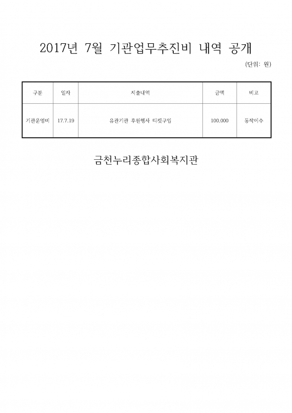공지사항 프로그램 안내 이야기로 만나는 우리동네 영상으로 만나는 우리동네 미디어로 만나는 우리동네 사회복지사가 소개하는 우리동네 공지사항 예산 공시 | 2017년 7월 기관업무추진비 내역 공개 2017-08-07 관련링크 본문 이전글 다음글 수정 삭제 목록 2025년 하반기 2025년 상반기 2024년 하반기 2024년 상반기 2023년 하반기 X 개인정보처리방침 금천누리종합사회복지관 개인정보취급방침 금천누리종합사회복지관(이하 “복지관”이라 함)이 취급하는 모든 개인정보는 관련법령에 근거하거나 정보주체의 동의에 의하여 수집 · 보유와 처리되고 있습니다. 복지관 개인정보처리방침은 「개인정보 보호법」 에 근거를 두고 있으며, 이러한 법령의 규정에 따라 수집 · 보유와 처리하는 개인정보를 공공업무의 적절한 수행과 국민의 권익을 보호하기 위해 적법하고 적정하게 취급할 것입니다. 또한, 복지관은 관련 법령에서 규정한 바에 따라 보유하고 있는 개인정보에 대한 열람청구권과 정정청구권 등 여러분의 권익을 존중하며, 이와 관련한 고충을 신속하고 원활하게 처리할 수 있도록 하기 위하여 다음과 같이 개인정보처리방침을 수립 · 공개합니다. 제1조(개인정보의 처리목적) 복지관은 다음의 목적을 위하여 개인정보를 처리합니다. 처리하고 있는 개인정보는 다음의 목적 이외의 용도로는 이용되지 않으며, 이용목적이 변경될 경우에는 개인정보보호법 제18조에 따라 별도의 동의를 받는 등 필요한 조치를 이행할 예정입니다. 1. 자원봉사 신청 및 자원봉사자 관리 자원봉사 의사 확인, 봉사활동 실시를 위한 자원봉사자의 교육, 사회복지봉사활동인증관리시스템(VMS) 실적입력, 배치신청, 증명서 발급, 소식지 발송, 만 14세 미만 아동의 개인정보 수집 이용 시 법정대리인의 동의여부 확인, 각종 고지·통지, 고충처리, 통계자료 작성 등을 목적으로 개인정보를 처리합니다. 2. 후원 신청 및 후원자 관리 후원과 관련된 기본적인 본인 식별, 기부금 출금, 기부금영수증 발급과 국세청 연말정산간소화서비스로의 정보제공, CMS 신규/해지와 출금요청을 위한 정보제공(금융결제원), 만 14세 미만 아동의 개인정보 수집 이용 시 법정대리인의 동의여부 확인, 각종 고지·통지, 고충처리, 통계자료 작성 등을 목적으로 개인정보를 처리합니다. 3. 시설대관 및 기관방문 업무 운영과 관리 등을 목적으로 개인정보를 처리합니다. 제2조(개인정보의 처리와 보유기간) ① 복지관 법령에 따른 개인정보 보유 · 이용기간 또는 정보주체로부터 개인정보를 수집 시에 동의 받은 개인정보 보유 · 이용기간 내에서 개인정보를 처리 · 보유합니다. ② 통신비밀보호법 제15조의 2(전기통신사업자의 협조의무)에 따른 통신사실 확인자료 보관 - 가입자 전기통신일시, 개시 · 종료시간, 상대방 가입자번호, 사용도수, 발신기지국 위치추적자료 : 12개월 - 컴퓨터통신, 인터넷 로그기록자료, 접속지 추적자료 : 3개월 제3조(개인정보의 제3자 제공) ① 복지관은 정보주체의 개인정보를 제1조(개인정보의 처리 목적)에서 명시한 범위 내에서만 처리하며, 정보주체의 동의, 법률의 특별한 규정 등 개인정보 보호법 제17조에 해당하는 경우에만 개인정보를 제3자에게 제공합니다. ② 복지관은 정보주체로부터 개인정보를 수집 시에 동의 받은 내용 내에서 개인정보를 제3자에게 제공합니다. 제4조(정보주체의 권리 · 의무와 행사방법) ① 정보주체는 복지관에 대해 언제든지 다음 각 호의 개인정보보호 관련 권리를 행사할 수 있습니다. 1. 개인정보 열람요구 2. 오류 등이 있을 경우 정정 요구 3. 삭제요구 4. 처리정지 요구 ② 제1항에 따른 권리 행사는 복지관에 대해 서면, 전화, 전자우편, 모사전송(FAX)등을 통하여 하실 수 있으며 복지관은 이에 대해 지체 없이 조치하겠습니다. ③ 정보주체가 개인정보의 오류 등에 대한 정정 또는 삭제를 요구한 경우에는 복지관은 정정 또는 삭제를 완료할 때까지 당해 개인정보를 이용하거나 제공하지 않습니다. ④ 제1항에 따른 권리 행사는 정보주체의 법정대리인이나 위임을 받은 자 등 대리인을 통하여 하실 수 있습니다. 이 경우 개인정보 보호법 시행규칙 별지 제11호 서식에 따른 위임장을 제출하셔야 합니다. ⑤ 정보주체는 개인정보 보호법 등 관계법령을 위반하여 복지관이 처리하고 있는 정보주체 본인이나 타인의 개인정보와 사생활을 침해하여서는 아니됩니다. 제5조(처리하는 개인정보 항목) ① 복지관은 다음의 개인정보 항목을 처리하고 있습니다. * 필수정보: 이름, 생년월일, 연락처, 주소, 소속, 후원금액, 후원계좌 ② 인터넷 서비스 이용과정에서 아래 개인정보 항목이 자동으로 생성되어 수집될 수 있습니다. - IP주소, 쿠키, MAC주소, 서비스 이용기록, 방문기록, 불량 이용기록 등 제6조(개인정보의 파기) ① 복지관은 개인정보 보유기간의 경과, 처리목적 달성 등 개인정보가 불필요하게 되었을 때에는 지체 없이 해당 개인정보를 파기합니다. 제7조(개인정보의 안전성 확보조치) 복지관은 개인정보의 안전성 확보를 위해 다음과 같은 조치를 취하고 있습니다. 1. 관리적 조치 : 보안서버(SSL) 운영, 내