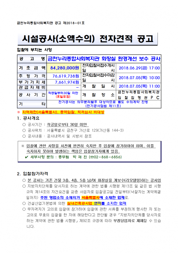공지사항 | 2018년도 기능보강사업(건축부문) 입찰 공고 2018-06-29 첨부파일 금천누리종합사회복지관 공고 제2018-01호.hwp (23.5K) 71회 다운로드 DATE : 2018-06-00 00:00:00 관련링크 본문 이전글 다음글 수정 삭제 목록