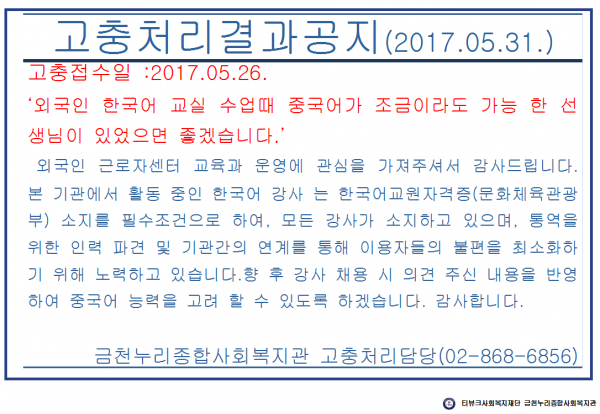 공지사항 프로그램 안내 이야기로 만나는 우리동네 영상으로 만나는 우리동네 미디어로 만나는 우리동네 사회복지사가 소개하는 우리동네 공지사항 공지사항 | 고충처리결과공지(2017.05.26) 2017-05-26 관련링크 본문 이전글 다음글 수정 삭제 목록 2025년 하반기 2025년 상반기 2024년 하반기 2024년 상반기 2023년 하반기 X 개인정보처리방침 금천누리종합사회복지관 개인정보취급방침 금천누리종합사회복지관(이하 “복지관”이라 함)이 취급하는 모든 개인정보는 관련법령에 근거하거나 정보주체의 동의에 의하여 수집 · 보유와 처리되고 있습니다. 복지관 개인정보처리방침은 「개인정보 보호법」 에 근거를 두고 있으며, 이러한 법령의 규정에 따라 수집 · 보유와 처리하는 개인정보를 공공업무의 적절한 수행과 국민의 권익을 보호하기 위해 적법하고 적정하게 취급할 것입니다. 또한, 복지관은 관련 법령에서 규정한 바에 따라 보유하고 있는 개인정보에 대한 열람청구권과 정정청구권 등 여러분의 권익을 존중하며, 이와 관련한 고충을 신속하고 원활하게 처리할 수 있도록 하기 위하여 다음과 같이 개인정보처리방침을 수립 · 공개합니다. 제1조(개인정보의 처리목적) 복지관은 다음의 목적을 위하여 개인정보를 처리합니다. 처리하고 있는 개인정보는 다음의 목적 이외의 용도로는 이용되지 않으며, 이용목적이 변경될 경우에는 개인정보보호법 제18조에 따라 별도의 동의를 받는 등 필요한 조치를 이행할 예정입니다. 1. 자원봉사 신청 및 자원봉사자 관리 자원봉사 의사 확인, 봉사활동 실시를 위한 자원봉사자의 교육, 사회복지봉사활동인증관리시스템(VMS) 실적입력, 배치신청, 증명서 발급, 소식지 발송, 만 14세 미만 아동의 개인정보 수집 이용 시 법정대리인의 동의여부 확인, 각종 고지·통지, 고충처리, 통계자료 작성 등을 목적으로 개인정보를 처리합니다. 2. 후원 신청 및 후원자 관리 후원과 관련된 기본적인 본인 식별, 기부금 출금, 기부금영수증 발급과 국세청 연말정산간소화서비스로의 정보제공, CMS 신규/해지와 출금요청을 위한 정보제공(금융결제원), 만 14세 미만 아동의 개인정보 수집 이용 시 법정대리인의 동의여부 확인, 각종 고지·통지, 고충처리, 통계자료 작성 등을 목적으로 개인정보를 처리합니다. 3. 시설대관 및 기관방문 업무 운영과 관리 등을 목적으로 개인정보를 처리합니다. 제2조(개인정보의 처리와 보유기간) ① 복지관 법령에 따른 개인정보 보유 · 이용기간 또는 정보주체로부터 개인정보를 수집 시에 동의 받은 개인정보 보유 · 이용기간 내에서 개인정보를 처리 · 보유합니다. ② 통신비밀보호법 제15조의 2(전기통신사업자의 협조의무)에 따른 통신사실 확인자료 보관 - 가입자 전기통신일시, 개시 · 종료시간, 상대방 가입자번호, 사용도수, 발신기지국 위치추적자료 : 12개월 - 컴퓨터통신, 인터넷 로그기록자료, 접속지 추적자료 : 3개월 제3조(개인정보의 제3자 제공) ① 복지관은 정보주체의 개인정보를 제1조(개인정보의 처리 목적)에서 명시한 범위 내에서만 처리하며, 정보주체의 동의, 법률의 특별한 규정 등 개인정보 보호법 제17조에 해당하는 경우에만 개인정보를 제3자에게 제공합니다. ② 복지관은 정보주체로부터 개인정보를 수집 시에 동의 받은 내용 내에서 개인정보를 제3자에게 제공합니다. 제4조(정보주체의 권리 · 의무와 행사방법) ① 정보주체는 복지관에 대해 언제든지 다음 각 호의 개인정보보호 관련 권리를 행사할 수 있습니다. 1. 개인정보 열람요구 2. 오류 등이 있을 경우 정정 요구 3. 삭제요구 4. 처리정지 요구 ② 제1항에 따른 권리 행사는 복지관에 대해 서면, 전화, 전자우편, 모사전송(FAX)등을 통하여 하실 수 있으며 복지관은 이에 대해 지체 없이 조치하겠습니다. ③ 정보주체가 개인정보의 오류 등에 대한 정정 또는 삭제를 요구한 경우에는 복지관은 정정 또는 삭제를 완료할 때까지 당해 개인정보를 이용하거나 제공하지 않습니다. ④ 제1항에 따른 권리 행사는 정보주체의 법정대리인이나 위임을 받은 자 등 대리인을 통하여 하실 수 있습니다. 이 경우 개인정보 보호법 시행규칙 별지 제11호 서식에 따른 위임장을 제출하셔야 합니다. ⑤ 정보주체는 개인정보 보호법 등 관계법령을 위반하여 복지관이 처리하고 있는 정보주체 본인이나 타인의 개인정보와 사생활을 침해하여서는 아니됩니다. 제5조(처리하는 개인정보 항목) ① 복지관은 다음의 개인정보 항목을 처리하고 있습니다. * 필수정보: 이름, 생년월일, 연락처, 주소, 소속, 후원금액, 후원계좌 ② 인터넷 서비스 이용과정에서 아래 개인정보 항목이 자동으로 생성되어 수집될 수 있습니다. - IP주소, 쿠키, MAC주소, 서비스 이용기록, 방문기록, 불량 이용기록 등 제6조(개인정보의 파기) ① 복지관은 개인정보 보유기간의 경과, 처리목적 달성 등 개인정보가 불필요하게 되었을 때에는 지체 없이 해당 개인정보를 파기합니다. 제7조(개인정보의 안전성 확보조치) 복지관은 개인정보의 안전성 확보를 위해 다음과 같은 조치를 취하고 있습니다. 1. 관리적 조치 : 보안서버(SSL) 운영, 내부관리계획