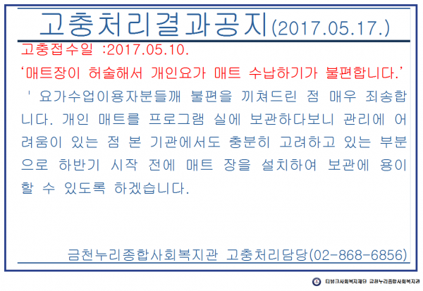 공지사항 프로그램 안내 이야기로 만나는 우리동네 영상으로 만나는 우리동네 미디어로 만나는 우리동네 사회복지사가 소개하는 우리동네 공지사항 공지사항 | 고충처리결과공지(2017.05.10) 2017-05-10 관련링크 본문 이전글 다음글 수정 삭제 목록 2025년 하반기 2025년 상반기 2024년 하반기 2024년 상반기 2023년 하반기 X 개인정보처리방침 금천누리종합사회복지관 개인정보취급방침 금천누리종합사회복지관(이하 “복지관”이라 함)이 취급하는 모든 개인정보는 관련법령에 근거하거나 정보주체의 동의에 의하여 수집 · 보유와 처리되고 있습니다. 복지관 개인정보처리방침은 「개인정보 보호법」 에 근거를 두고 있으며, 이러한 법령의 규정에 따라 수집 · 보유와 처리하는 개인정보를 공공업무의 적절한 수행과 국민의 권익을 보호하기 위해 적법하고 적정하게 취급할 것입니다. 또한, 복지관은 관련 법령에서 규정한 바에 따라 보유하고 있는 개인정보에 대한 열람청구권과 정정청구권 등 여러분의 권익을 존중하며, 이와 관련한 고충을 신속하고 원활하게 처리할 수 있도록 하기 위하여 다음과 같이 개인정보처리방침을 수립 · 공개합니다. 제1조(개인정보의 처리목적) 복지관은 다음의 목적을 위하여 개인정보를 처리합니다. 처리하고 있는 개인정보는 다음의 목적 이외의 용도로는 이용되지 않으며, 이용목적이 변경될 경우에는 개인정보보호법 제18조에 따라 별도의 동의를 받는 등 필요한 조치를 이행할 예정입니다. 1. 자원봉사 신청 및 자원봉사자 관리 자원봉사 의사 확인, 봉사활동 실시를 위한 자원봉사자의 교육, 사회복지봉사활동인증관리시스템(VMS) 실적입력, 배치신청, 증명서 발급, 소식지 발송, 만 14세 미만 아동의 개인정보 수집 이용 시 법정대리인의 동의여부 확인, 각종 고지·통지, 고충처리, 통계자료 작성 등을 목적으로 개인정보를 처리합니다. 2. 후원 신청 및 후원자 관리 후원과 관련된 기본적인 본인 식별, 기부금 출금, 기부금영수증 발급과 국세청 연말정산간소화서비스로의 정보제공, CMS 신규/해지와 출금요청을 위한 정보제공(금융결제원), 만 14세 미만 아동의 개인정보 수집 이용 시 법정대리인의 동의여부 확인, 각종 고지·통지, 고충처리, 통계자료 작성 등을 목적으로 개인정보를 처리합니다. 3. 시설대관 및 기관방문 업무 운영과 관리 등을 목적으로 개인정보를 처리합니다. 제2조(개인정보의 처리와 보유기간) ① 복지관 법령에 따른 개인정보 보유 · 이용기간 또는 정보주체로부터 개인정보를 수집 시에 동의 받은 개인정보 보유 · 이용기간 내에서 개인정보를 처리 · 보유합니다. ② 통신비밀보호법 제15조의 2(전기통신사업자의 협조의무)에 따른 통신사실 확인자료 보관 - 가입자 전기통신일시, 개시 · 종료시간, 상대방 가입자번호, 사용도수, 발신기지국 위치추적자료 : 12개월 - 컴퓨터통신, 인터넷 로그기록자료, 접속지 추적자료 : 3개월 제3조(개인정보의 제3자 제공) ① 복지관은 정보주체의 개인정보를 제1조(개인정보의 처리 목적)에서 명시한 범위 내에서만 처리하며, 정보주체의 동의, 법률의 특별한 규정 등 개인정보 보호법 제17조에 해당하는 경우에만 개인정보를 제3자에게 제공합니다. ② 복지관은 정보주체로부터 개인정보를 수집 시에 동의 받은 내용 내에서 개인정보를 제3자에게 제공합니다. 제4조(정보주체의 권리 · 의무와 행사방법) ① 정보주체는 복지관에 대해 언제든지 다음 각 호의 개인정보보호 관련 권리를 행사할 수 있습니다. 1. 개인정보 열람요구 2. 오류 등이 있을 경우 정정 요구 3. 삭제요구 4. 처리정지 요구 ② 제1항에 따른 권리 행사는 복지관에 대해 서면, 전화, 전자우편, 모사전송(FAX)등을 통하여 하실 수 있으며 복지관은 이에 대해 지체 없이 조치하겠습니다. ③ 정보주체가 개인정보의 오류 등에 대한 정정 또는 삭제를 요구한 경우에는 복지관은 정정 또는 삭제를 완료할 때까지 당해 개인정보를 이용하거나 제공하지 않습니다. ④ 제1항에 따른 권리 행사는 정보주체의 법정대리인이나 위임을 받은 자 등 대리인을 통하여 하실 수 있습니다. 이 경우 개인정보 보호법 시행규칙 별지 제11호 서식에 따른 위임장을 제출하셔야 합니다. ⑤ 정보주체는 개인정보 보호법 등 관계법령을 위반하여 복지관이 처리하고 있는 정보주체 본인이나 타인의 개인정보와 사생활을 침해하여서는 아니됩니다. 제5조(처리하는 개인정보 항목) ① 복지관은 다음의 개인정보 항목을 처리하고 있습니다. * 필수정보: 이름, 생년월일, 연락처, 주소, 소속, 후원금액, 후원계좌 ② 인터넷 서비스 이용과정에서 아래 개인정보 항목이 자동으로 생성되어 수집될 수 있습니다. - IP주소, 쿠키, MAC주소, 서비스 이용기록, 방문기록, 불량 이용기록 등 제6조(개인정보의 파기) ① 복지관은 개인정보 보유기간의 경과, 처리목적 달성 등 개인정보가 불필요하게 되었을 때에는 지체 없이 해당 개인정보를 파기합니다. 제7조(개인정보의 안전성 확보조치) 복지관은 개인정보의 안전성 확보를 위해 다음과 같은 조치를 취하고 있습니다. 1. 관리적 조치 : 보안서버(SSL) 운영, 내부관리계획