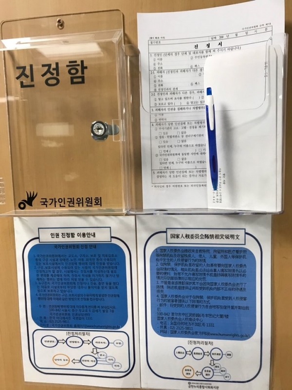 *본인의 인권이 침해되었거나, 타인의 인권이 침해 행위를 목격한 경우 진정함 옆에 배치되어 있는 진정서(전용용지를)작성하여 인권진정함에 넣어주세요. 진정함에 넣은 진정서는 국가인권위원회에 접수 됩니다.