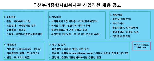 ※ 이력서는 반드시 첨부된 기관양식으로 작성해 주시고, 메일 접수 시 1개 파일로 압축하여 제출해주시기 바랍니다. 이력서 양식은 금천누리종합사회복지관 홈페이지에서 확인 가능합니다. 감사합니다.