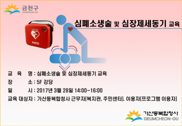 공지사항 프로그램 안내 이야기로 만나는 우리동네 영상으로 만나는 우리동네 미디어로 만나는 우리동네 사회복지사가 소개하는 우리동네 공지사항 공지사항 | 심폐소생술 및 심장제세동기 교육 2017-03-06 관련링크 본문 이전글 다음글 수정 삭제 목록 2025년 하반기 2025년 상반기 2024년 하반기 2024년 상반기 2023년 하반기 X 개인정보처리방침 금천누리종합사회복지관 개인정보취급방침 금천누리종합사회복지관(이하 “복지관”이라 함)이 취급하는 모든 개인정보는 관련법령에 근거하거나 정보주체의 동의에 의하여 수집 · 보유와 처리되고 있습니다. 복지관 개인정보처리방침은 「개인정보 보호법」 에 근거를 두고 있으며, 이러한 법령의 규정에 따라 수집 · 보유와 처리하는 개인정보를 공공업무의 적절한 수행과 국민의 권익을 보호하기 위해 적법하고 적정하게 취급할 것입니다. 또한, 복지관은 관련 법령에서 규정한 바에 따라 보유하고 있는 개인정보에 대한 열람청구권과 정정청구권 등 여러분의 권익을 존중하며, 이와 관련한 고충을 신속하고 원활하게 처리할 수 있도록 하기 위하여 다음과 같이 개인정보처리방침을 수립 · 공개합니다. 제1조(개인정보의 처리목적) 복지관은 다음의 목적을 위하여 개인정보를 처리합니다. 처리하고 있는 개인정보는 다음의 목적 이외의 용도로는 이용되지 않으며, 이용목적이 변경될 경우에는 개인정보보호법 제18조에 따라 별도의 동의를 받는 등 필요한 조치를 이행할 예정입니다. 1. 자원봉사 신청 및 자원봉사자 관리 자원봉사 의사 확인, 봉사활동 실시를 위한 자원봉사자의 교육, 사회복지봉사활동인증관리시스템(VMS) 실적입력, 배치신청, 증명서 발급, 소식지 발송, 만 14세 미만 아동의 개인정보 수집 이용 시 법정대리인의 동의여부 확인, 각종 고지·통지, 고충처리, 통계자료 작성 등을 목적으로 개인정보를 처리합니다. 2. 후원 신청 및 후원자 관리 후원과 관련된 기본적인 본인 식별, 기부금 출금, 기부금영수증 발급과 국세청 연말정산간소화서비스로의 정보제공, CMS 신규/해지와 출금요청을 위한 정보제공(금융결제원), 만 14세 미만 아동의 개인정보 수집 이용 시 법정대리인의 동의여부 확인, 각종 고지·통지, 고충처리, 통계자료 작성 등을 목적으로 개인정보를 처리합니다. 3. 시설대관 및 기관방문 업무 운영과 관리 등을 목적으로 개인정보를 처리합니다. 제2조(개인정보의 처리와 보유기간) ① 복지관 법령에 따른 개인정보 보유 · 이용기간 또는 정보주체로부터 개인정보를 수집 시에 동의 받은 개인정보 보유 · 이용기간 내에서 개인정보를 처리 · 보유합니다. ② 통신비밀보호법 제15조의 2(전기통신사업자의 협조의무)에 따른 통신사실 확인자료 보관 - 가입자 전기통신일시, 개시 · 종료시간, 상대방 가입자번호, 사용도수, 발신기지국 위치추적자료 : 12개월 - 컴퓨터통신, 인터넷 로그기록자료, 접속지 추적자료 : 3개월 제3조(개인정보의 제3자 제공) ① 복지관은 정보주체의 개인정보를 제1조(개인정보의 처리 목적)에서 명시한 범위 내에서만 처리하며, 정보주체의 동의, 법률의 특별한 규정 등 개인정보 보호법 제17조에 해당하는 경우에만 개인정보를 제3자에게 제공합니다. ② 복지관은 정보주체로부터 개인정보를 수집 시에 동의 받은 내용 내에서 개인정보를 제3자에게 제공합니다. 제4조(정보주체의 권리 · 의무와 행사방법) ① 정보주체는 복지관에 대해 언제든지 다음 각 호의 개인정보보호 관련 권리를 행사할 수 있습니다. 1. 개인정보 열람요구 2. 오류 등이 있을 경우 정정 요구 3. 삭제요구 4. 처리정지 요구 ② 제1항에 따른 권리 행사는 복지관에 대해 서면, 전화, 전자우편, 모사전송(FAX)등을 통하여 하실 수 있으며 복지관은 이에 대해 지체 없이 조치하겠습니다. ③ 정보주체가 개인정보의 오류 등에 대한 정정 또는 삭제를 요구한 경우에는 복지관은 정정 또는 삭제를 완료할 때까지 당해 개인정보를 이용하거나 제공하지 않습니다. ④ 제1항에 따른 권리 행사는 정보주체의 법정대리인이나 위임을 받은 자 등 대리인을 통하여 하실 수 있습니다. 이 경우 개인정보 보호법 시행규칙 별지 제11호 서식에 따른 위임장을 제출하셔야 합니다. ⑤ 정보주체는 개인정보 보호법 등 관계법령을 위반하여 복지관이 처리하고 있는 정보주체 본인이나 타인의 개인정보와 사생활을 침해하여서는 아니됩니다. 제5조(처리하는 개인정보 항목) ① 복지관은 다음의 개인정보 항목을 처리하고 있습니다. * 필수정보: 이름, 생년월일, 연락처, 주소, 소속, 후원금액, 후원계좌 ② 인터넷 서비스 이용과정에서 아래 개인정보 항목이 자동으로 생성되어 수집될 수 있습니다. - IP주소, 쿠키, MAC주소, 서비스 이용기록, 방문기록, 불량 이용기록 등 제6조(개인정보의 파기) ① 복지관은 개인정보 보유기간의 경과, 처리목적 달성 등 개인정보가 불필요하게 되었을 때에는 지체 없이 해당 개인정보를 파기합니다. 제7조(개인정보의 안전성 확보조치) 복지관은 개인정보의 안전성 확보를 위해 다음과 같은 조치를 취하고 있습니다. 1. 관리적 조치 : 보안서버(SSL) 운영, 내부관