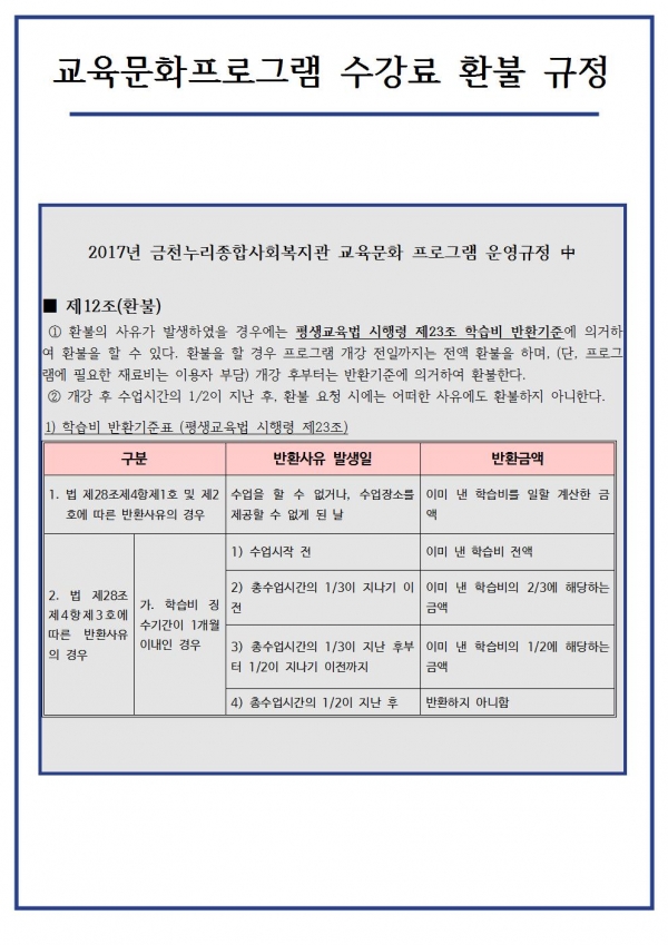 공지사항 프로그램 안내 이야기로 만나는 우리동네 영상으로 만나는 우리동네 미디어로 만나는 우리동네 사회복지사가 소개하는 우리동네 공지사항 공지사항 | 교육문화프로그램 수강료 환불 규정 2017-03-10 관련링크 본문 이전글 다음글 수정 삭제 목록 2025년 하반기 2025년 상반기 2024년 하반기 2024년 상반기 2023년 하반기 X 개인정보처리방침 금천누리종합사회복지관 개인정보취급방침 금천누리종합사회복지관(이하 “복지관”이라 함)이 취급하는 모든 개인정보는 관련법령에 근거하거나 정보주체의 동의에 의하여 수집 · 보유와 처리되고 있습니다. 복지관 개인정보처리방침은 「개인정보 보호법」 에 근거를 두고 있으며, 이러한 법령의 규정에 따라 수집 · 보유와 처리하는 개인정보를 공공업무의 적절한 수행과 국민의 권익을 보호하기 위해 적법하고 적정하게 취급할 것입니다. 또한, 복지관은 관련 법령에서 규정한 바에 따라 보유하고 있는 개인정보에 대한 열람청구권과 정정청구권 등 여러분의 권익을 존중하며, 이와 관련한 고충을 신속하고 원활하게 처리할 수 있도록 하기 위하여 다음과 같이 개인정보처리방침을 수립 · 공개합니다. 제1조(개인정보의 처리목적) 복지관은 다음의 목적을 위하여 개인정보를 처리합니다. 처리하고 있는 개인정보는 다음의 목적 이외의 용도로는 이용되지 않으며, 이용목적이 변경될 경우에는 개인정보보호법 제18조에 따라 별도의 동의를 받는 등 필요한 조치를 이행할 예정입니다. 1. 자원봉사 신청 및 자원봉사자 관리 자원봉사 의사 확인, 봉사활동 실시를 위한 자원봉사자의 교육, 사회복지봉사활동인증관리시스템(VMS) 실적입력, 배치신청, 증명서 발급, 소식지 발송, 만 14세 미만 아동의 개인정보 수집 이용 시 법정대리인의 동의여부 확인, 각종 고지·통지, 고충처리, 통계자료 작성 등을 목적으로 개인정보를 처리합니다. 2. 후원 신청 및 후원자 관리 후원과 관련된 기본적인 본인 식별, 기부금 출금, 기부금영수증 발급과 국세청 연말정산간소화서비스로의 정보제공, CMS 신규/해지와 출금요청을 위한 정보제공(금융결제원), 만 14세 미만 아동의 개인정보 수집 이용 시 법정대리인의 동의여부 확인, 각종 고지·통지, 고충처리, 통계자료 작성 등을 목적으로 개인정보를 처리합니다. 3. 시설대관 및 기관방문 업무 운영과 관리 등을 목적으로 개인정보를 처리합니다. 제2조(개인정보의 처리와 보유기간) ① 복지관 법령에 따른 개인정보 보유 · 이용기간 또는 정보주체로부터 개인정보를 수집 시에 동의 받은 개인정보 보유 · 이용기간 내에서 개인정보를 처리 · 보유합니다. ② 통신비밀보호법 제15조의 2(전기통신사업자의 협조의무)에 따른 통신사실 확인자료 보관 - 가입자 전기통신일시, 개시 · 종료시간, 상대방 가입자번호, 사용도수, 발신기지국 위치추적자료 : 12개월 - 컴퓨터통신, 인터넷 로그기록자료, 접속지 추적자료 : 3개월 제3조(개인정보의 제3자 제공) ① 복지관은 정보주체의 개인정보를 제1조(개인정보의 처리 목적)에서 명시한 범위 내에서만 처리하며, 정보주체의 동의, 법률의 특별한 규정 등 개인정보 보호법 제17조에 해당하는 경우에만 개인정보를 제3자에게 제공합니다. ② 복지관은 정보주체로부터 개인정보를 수집 시에 동의 받은 내용 내에서 개인정보를 제3자에게 제공합니다. 제4조(정보주체의 권리 · 의무와 행사방법) ① 정보주체는 복지관에 대해 언제든지 다음 각 호의 개인정보보호 관련 권리를 행사할 수 있습니다. 1. 개인정보 열람요구 2. 오류 등이 있을 경우 정정 요구 3. 삭제요구 4. 처리정지 요구 ② 제1항에 따른 권리 행사는 복지관에 대해 서면, 전화, 전자우편, 모사전송(FAX)등을 통하여 하실 수 있으며 복지관은 이에 대해 지체 없이 조치하겠습니다. ③ 정보주체가 개인정보의 오류 등에 대한 정정 또는 삭제를 요구한 경우에는 복지관은 정정 또는 삭제를 완료할 때까지 당해 개인정보를 이용하거나 제공하지 않습니다. ④ 제1항에 따른 권리 행사는 정보주체의 법정대리인이나 위임을 받은 자 등 대리인을 통하여 하실 수 있습니다. 이 경우 개인정보 보호법 시행규칙 별지 제11호 서식에 따른 위임장을 제출하셔야 합니다. ⑤ 정보주체는 개인정보 보호법 등 관계법령을 위반하여 복지관이 처리하고 있는 정보주체 본인이나 타인의 개인정보와 사생활을 침해하여서는 아니됩니다. 제5조(처리하는 개인정보 항목) ① 복지관은 다음의 개인정보 항목을 처리하고 있습니다. * 필수정보: 이름, 생년월일, 연락처, 주소, 소속, 후원금액, 후원계좌 ② 인터넷 서비스 이용과정에서 아래 개인정보 항목이 자동으로 생성되어 수집될 수 있습니다. - IP주소, 쿠키, MAC주소, 서비스 이용기록, 방문기록, 불량 이용기록 등 제6조(개인정보의 파기) ① 복지관은 개인정보 보유기간의 경과, 처리목적 달성 등 개인정보가 불필요하게 되었을 때에는 지체 없이 해당 개인정보를 파기합니다. 제7조(개인정보의 안전성 확보조치) 복지관은 개인정보의 안전성 확보를 위해 다음과 같은 조치를 취하고 있습니다. 1. 관리적 조치 : 보안서버(SSL) 운영, 내부