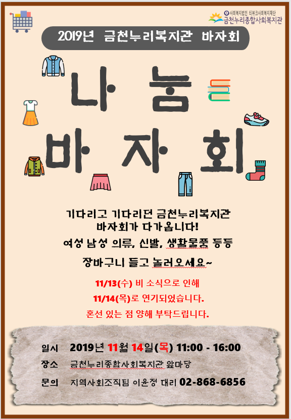 공지사항 프로그램 안내 이야기로 만나는 우리동네 영상으로 만나는 우리동네 미디어로 만나는 우리동네 사회복지사가 소개하는 우리동네 프로그램 안내 금천누리종합사회복지관에서 진행하는 다양한 프로그램을 안내해드립니다. 금천누리 나눔 바자회 2019-11-05 관련링크 본문 11월 13일(수)로 예정되었던 바자회가 우천으로 인하여 11월 14일(목)로 연기되었습니다. 혼선 빚은 점 양해부탁드리며, 바자회에 많이 놀러오세요! 이전글 다음글 수정 삭제 목록 2025년 하반기 2025년 상반기 2024년 하반기 2024년 상반기 2023년 하반기 X 개인정보처리방침 금천누리종합사회복지관 개인정보취급방침 금천누리종합사회복지관(이하 “복지관”이라 함)이 취급하는 모든 개인정보는 관련법령에 근거하거나 정보주체의 동의에 의하여 수집 · 보유와 처리되고 있습니다. 복지관 개인정보처리방침은 「개인정보 보호법」 에 근거를 두고 있으며, 이러한 법령의 규정에 따라 수집 · 보유와 처리하는 개인정보를 공공업무의 적절한 수행과 국민의 권익을 보호하기 위해 적법하고 적정하게 취급할 것입니다. 또한, 복지관은 관련 법령에서 규정한 바에 따라 보유하고 있는 개인정보에 대한 열람청구권과 정정청구권 등 여러분의 권익을 존중하며, 이와 관련한 고충을 신속하고 원활하게 처리할 수 있도록 하기 위하여 다음과 같이 개인정보처리방침을 수립 · 공개합니다. 제1조(개인정보의 처리목적) 복지관은 다음의 목적을 위하여 개인정보를 처리합니다. 처리하고 있는 개인정보는 다음의 목적 이외의 용도로는 이용되지 않으며, 이용목적이 변경될 경우에는 개인정보보호법 제18조에 따라 별도의 동의를 받는 등 필요한 조치를 이행할 예정입니다. 1. 자원봉사 신청 및 자원봉사자 관리 자원봉사 의사 확인, 봉사활동 실시를 위한 자원봉사자의 교육, 사회복지봉사활동인증관리시스템(VMS) 실적입력, 배치신청, 증명서 발급, 소식지 발송, 만 14세 미만 아동의 개인정보 수집 이용 시 법정대리인의 동의여부 확인, 각종 고지·통지, 고충처리, 통계자료 작성 등을 목적으로 개인정보를 처리합니다. 2. 후원 신청 및 후원자 관리 후원과 관련된 기본적인 본인 식별, 기부금 출금, 기부금영수증 발급과 국세청 연말정산간소화서비스로의 정보제공, CMS 신규/해지와 출금요청을 위한 정보제공(금융결제원), 만 14세 미만 아동의 개인정보 수집 이용 시 법정대리인의 동의여부 확인, 각종 고지·통지, 고충처리, 통계자료 작성 등을 목적으로 개인정보를 처리합니다. 3. 시설대관 및 기관방문 업무 운영과 관리 등을 목적으로 개인정보를 처리합니다. 제2조(개인정보의 처리와 보유기간) ① 복지관 법령에 따른 개인정보 보유 · 이용기간 또는 정보주체로부터 개인정보를 수집 시에 동의 받은 개인정보 보유 · 이용기간 내에서 개인정보를 처리 · 보유합니다. ② 통신비밀보호법 제15조의 2(전기통신사업자의 협조의무)에 따른 통신사실 확인자료 보관 - 가입자 전기통신일시, 개시 · 종료시간, 상대방 가입자번호, 사용도수, 발신기지국 위치추적자료 : 12개월 - 컴퓨터통신, 인터넷 로그기록자료, 접속지 추적자료 : 3개월 제3조(개인정보의 제3자 제공) ① 복지관은 정보주체의 개인정보를 제1조(개인정보의 처리 목적)에서 명시한 범위 내에서만 처리하며, 정보주체의 동의, 법률의 특별한 규정 등 개인정보 보호법 제17조에 해당하는 경우에만 개인정보를 제3자에게 제공합니다. ② 복지관은 정보주체로부터 개인정보를 수집 시에 동의 받은 내용 내에서 개인정보를 제3자에게 제공합니다. 제4조(정보주체의 권리 · 의무와 행사방법) ① 정보주체는 복지관에 대해 언제든지 다음 각 호의 개인정보보호 관련 권리를 행사할 수 있습니다. 1. 개인정보 열람요구 2. 오류 등이 있을 경우 정정 요구 3. 삭제요구 4. 처리정지 요구 ② 제1항에 따른 권리 행사는 복지관에 대해 서면, 전화, 전자우편, 모사전송(FAX)등을 통하여 하실 수 있으며 복지관은 이에 대해 지체 없이 조치하겠습니다. ③ 정보주체가 개인정보의 오류 등에 대한 정정 또는 삭제를 요구한 경우에는 복지관은 정정 또는 삭제를 완료할 때까지 당해 개인정보를 이용하거나 제공하지 않습니다. ④ 제1항에 따른 권리 행사는 정보주체의 법정대리인이나 위임을 받은 자 등 대리인을 통하여 하실 수 있습니다. 이 경우 개인정보 보호법 시행규칙 별지 제11호 서식에 따른 위임장을 제출하셔야 합니다. ⑤ 정보주체는 개인정보 보호법 등 관계법령을 위반하여 복지관이 처리하고 있는 정보주체 본인이나 타인의 개인정보와 사생활을 침해하여서는 아니됩니다. 제5조(처리하는 개인정보 항목) ① 복지관은 다음의 개인정보 항목을 처리하고 있습니다. * 필수정보: 이름, 생년월일, 연락처, 주소, 소속, 후원금액, 후원계좌 ② 인터넷 서비스 이용과정에서 아래 개인정보 항목이 자동으로 생성되어 수집될 수 있습니다. - IP주소, 쿠키, MAC주소, 서비스 이용기록, 방문기록, 불량 이용기록 등 제6조(개인정보의 파기) ① 복지관은 개인정보 보유기간의 경과, 처리목적 달성 등 개인정보가 불필요하게 되었을 때