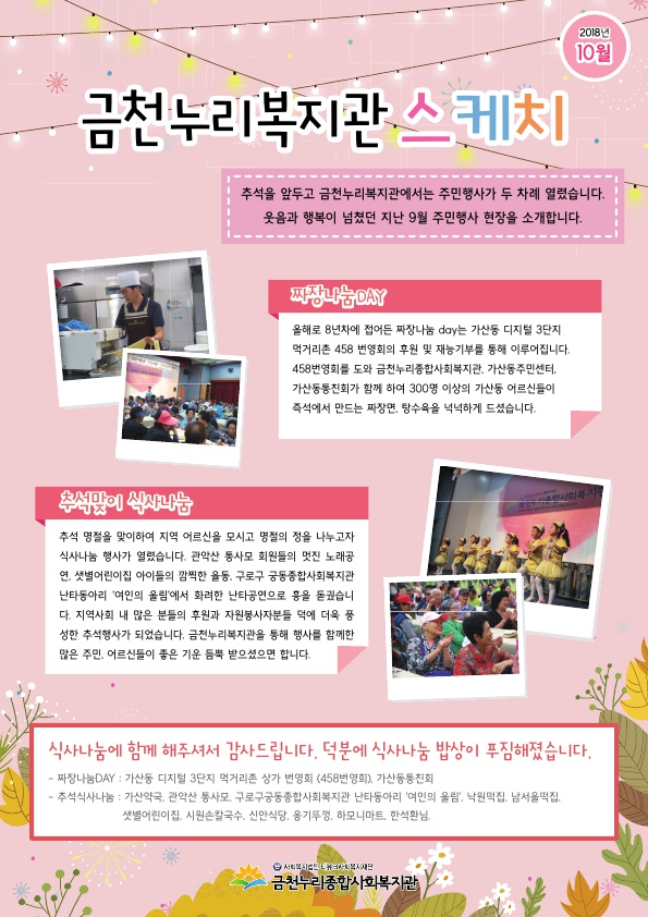 2018년 11월의 금천누리종합사회복지관 2018-11-02 관련링크 본문 금천누리종합사회복지관 11월 소식입니다. 11월의 금천누리복지관은 아동교육문화프로그램 안내, 지난 9월 주민행사를 소개합니다. 11월 복지관 소식 및 동네 이야기에 많은 관심 가져주시길 바랍니다. 이전글 다음글 수정 삭제 목록