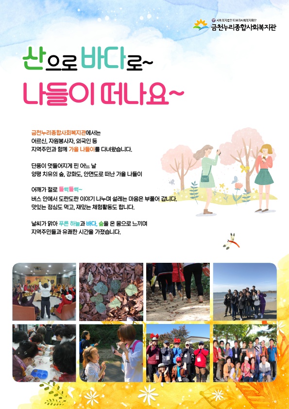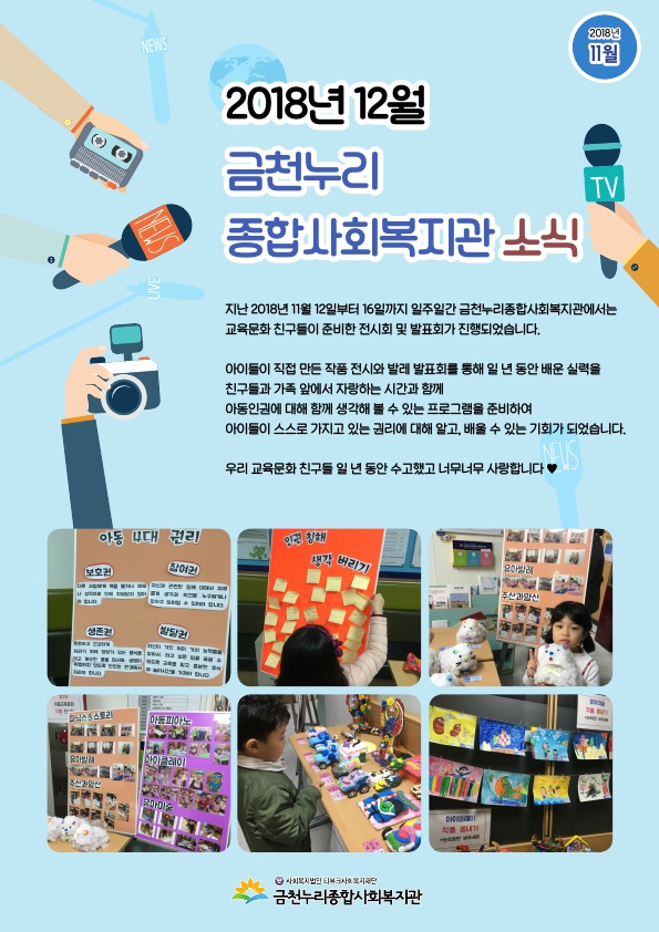 2018년 12월의 금천누리종합사회복지관 2018-11-29 관련링크 본문 금천누리종합사회복지관 12월 소식입니다. 12월의 금천누리복지관은 11월 내 한 주간 진행되었던 아동교육문화 전시회 및 발표회 소식, 복지관 가을 나들이 소식을 소개합니다. 12월 복지관 소식 및 동네 이야기에 많은 관심 가져주셔서 감사합니다~ 이전글 다음글 수정 삭제 목록