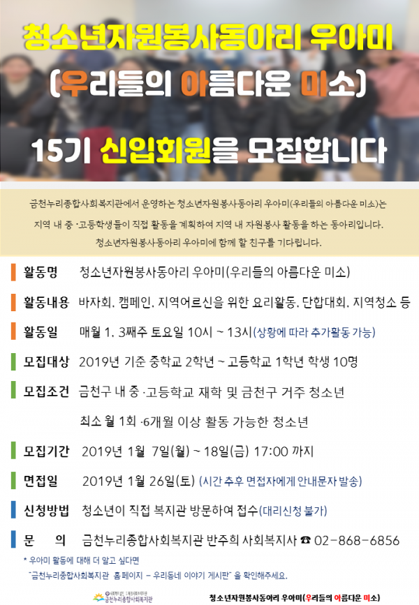 청소년자원봉사동아리 우아미 15기 회원 모집 2018-12-24 관련링크 본문 청소년자원봉사동아리 '우아미(우리들의 아름다운 미소)' 15기 신입회원을 모집합니다. 청소년자원봉사동아리 '우아미'는 금천구 지역 내 중고등학생들이 직접 봉사활동을 계획하고 진행하는 동아리입니다. 청소년자원봉사동아리 우아미에 함께할 15기 청소년을 기다립니다. * 모집내용은 아래 홍보지를 참고해주세요. * 문의 : 금천누리종합사회복지관 반주희 사회복지사 02-868-6856 이전글 다음글 수정 삭제 목록