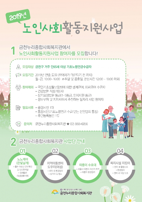 2019년 2월의 금천누리종합사회복지관 2019-02-07 관련링크 본문 금천누리종합사회복지관 2019년 2월 소식입니다. 노인사회활동지원사업 모집과 금천누리복지관 여성가장자조모임 금천Mom 참여자 모집 소식을 소개합니다. 2월 복지관 소식 및 동네 이야기에 많은 관심 가져주시길 바랍니다. * 현재 페이지에서 월홍보지 글씨가 깨져보일 시에, 첨부파일을 참고하여 읽어주시면 감사하겠습니다.^^ 이전글 다음글 수정 삭제 목록