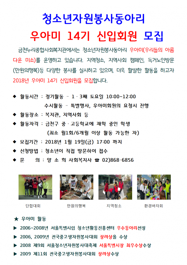 청소년자원봉사동아리 우아미 14기 모집 2018-02-28 관련링크 본문 금천누리종합사회복지관에서는 청소년자원봉사동아리 우아미(우리들의 아름다운 미소) 14기 신입회원을 모집합니다. 이전글 다음글 수정 삭제 목록