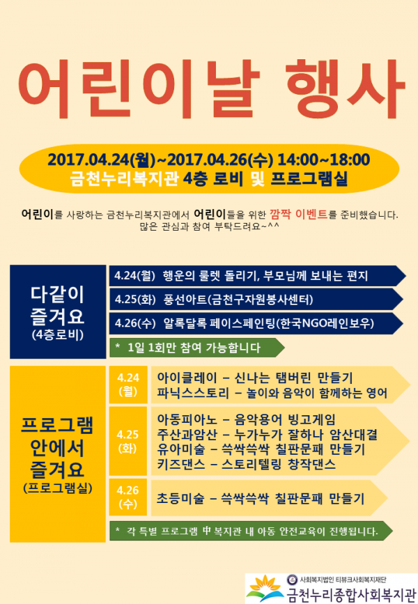 공지사항 프로그램 안내 이야기로 만나는 우리동네 영상으로 만나는 우리동네 미디어로 만나는 우리동네 사회복지사가 소개하는 우리동네 프로그램 안내 금천누리종합사회복지관에서 진행하는 다양한 프로그램을 안내해드립니다. 2017년 어린이날 행사 안내 2017-04-20 관련링크 본문 이전글 다음글 수정 삭제 목록 2025년 하반기 2025년 상반기 2024년 하반기 2024년 상반기 2023년 하반기 X 개인정보처리방침 금천누리종합사회복지관 개인정보취급방침 금천누리종합사회복지관(이하 “복지관”이라 함)이 취급하는 모든 개인정보는 관련법령에 근거하거나 정보주체의 동의에 의하여 수집 · 보유와 처리되고 있습니다. 복지관 개인정보처리방침은 「개인정보 보호법」 에 근거를 두고 있으며, 이러한 법령의 규정에 따라 수집 · 보유와 처리하는 개인정보를 공공업무의 적절한 수행과 국민의 권익을 보호하기 위해 적법하고 적정하게 취급할 것입니다. 또한, 복지관은 관련 법령에서 규정한 바에 따라 보유하고 있는 개인정보에 대한 열람청구권과 정정청구권 등 여러분의 권익을 존중하며, 이와 관련한 고충을 신속하고 원활하게 처리할 수 있도록 하기 위하여 다음과 같이 개인정보처리방침을 수립 · 공개합니다. 제1조(개인정보의 처리목적) 복지관은 다음의 목적을 위하여 개인정보를 처리합니다. 처리하고 있는 개인정보는 다음의 목적 이외의 용도로는 이용되지 않으며, 이용목적이 변경될 경우에는 개인정보보호법 제18조에 따라 별도의 동의를 받는 등 필요한 조치를 이행할 예정입니다. 1. 자원봉사 신청 및 자원봉사자 관리 자원봉사 의사 확인, 봉사활동 실시를 위한 자원봉사자의 교육, 사회복지봉사활동인증관리시스템(VMS) 실적입력, 배치신청, 증명서 발급, 소식지 발송, 만 14세 미만 아동의 개인정보 수집 이용 시 법정대리인의 동의여부 확인, 각종 고지·통지, 고충처리, 통계자료 작성 등을 목적으로 개인정보를 처리합니다. 2. 후원 신청 및 후원자 관리 후원과 관련된 기본적인 본인 식별, 기부금 출금, 기부금영수증 발급과 국세청 연말정산간소화서비스로의 정보제공, CMS 신규/해지와 출금요청을 위한 정보제공(금융결제원), 만 14세 미만 아동의 개인정보 수집 이용 시 법정대리인의 동의여부 확인, 각종 고지·통지, 고충처리, 통계자료 작성 등을 목적으로 개인정보를 처리합니다. 3. 시설대관 및 기관방문 업무 운영과 관리 등을 목적으로 개인정보를 처리합니다. 제2조(개인정보의 처리와 보유기간) ① 복지관 법령에 따른 개인정보 보유 · 이용기간 또는 정보주체로부터 개인정보를 수집 시에 동의 받은 개인정보 보유 · 이용기간 내에서 개인정보를 처리 · 보유합니다. ② 통신비밀보호법 제15조의 2(전기통신사업자의 협조의무)에 따른 통신사실 확인자료 보관 - 가입자 전기통신일시, 개시 · 종료시간, 상대방 가입자번호, 사용도수, 발신기지국 위치추적자료 : 12개월 - 컴퓨터통신, 인터넷 로그기록자료, 접속지 추적자료 : 3개월 제3조(개인정보의 제3자 제공) ① 복지관은 정보주체의 개인정보를 제1조(개인정보의 처리 목적)에서 명시한 범위 내에서만 처리하며, 정보주체의 동의, 법률의 특별한 규정 등 개인정보 보호법 제17조에 해당하는 경우에만 개인정보를 제3자에게 제공합니다. ② 복지관은 정보주체로부터 개인정보를 수집 시에 동의 받은 내용 내에서 개인정보를 제3자에게 제공합니다. 제4조(정보주체의 권리 · 의무와 행사방법) ① 정보주체는 복지관에 대해 언제든지 다음 각 호의 개인정보보호 관련 권리를 행사할 수 있습니다. 1. 개인정보 열람요구 2. 오류 등이 있을 경우 정정 요구 3. 삭제요구 4. 처리정지 요구 ② 제1항에 따른 권리 행사는 복지관에 대해 서면, 전화, 전자우편, 모사전송(FAX)등을 통하여 하실 수 있으며 복지관은 이에 대해 지체 없이 조치하겠습니다. ③ 정보주체가 개인정보의 오류 등에 대한 정정 또는 삭제를 요구한 경우에는 복지관은 정정 또는 삭제를 완료할 때까지 당해 개인정보를 이용하거나 제공하지 않습니다. ④ 제1항에 따른 권리 행사는 정보주체의 법정대리인이나 위임을 받은 자 등 대리인을 통하여 하실 수 있습니다. 이 경우 개인정보 보호법 시행규칙 별지 제11호 서식에 따른 위임장을 제출하셔야 합니다. ⑤ 정보주체는 개인정보 보호법 등 관계법령을 위반하여 복지관이 처리하고 있는 정보주체 본인이나 타인의 개인정보와 사생활을 침해하여서는 아니됩니다. 제5조(처리하는 개인정보 항목) ① 복지관은 다음의 개인정보 항목을 처리하고 있습니다. * 필수정보: 이름, 생년월일, 연락처, 주소, 소속, 후원금액, 후원계좌 ② 인터넷 서비스 이용과정에서 아래 개인정보 항목이 자동으로 생성되어 수집될 수 있습니다. - IP주소, 쿠키, MAC주소, 서비스 이용기록, 방문기록, 불량 이용기록 등 제6조(개인정보의 파기) ① 복지관은 개인정보 보유기간의 경과, 처리목적 달성 등 개인정보가 불필요하게 되었을 때에는 지체 없이 해당 개인정보를 파기합니다. 제7조(개인정보의 안전성 확보조치) 복지관은 개인정보의 안전성 확보를 위해 다음과 같은 조치