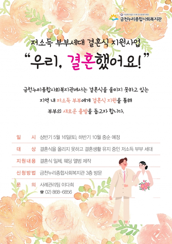 금천누리종합사회복지관 직원들이 전하는 새해인사저소득 부부세대 결혼식 지원사업을 안내합니다.