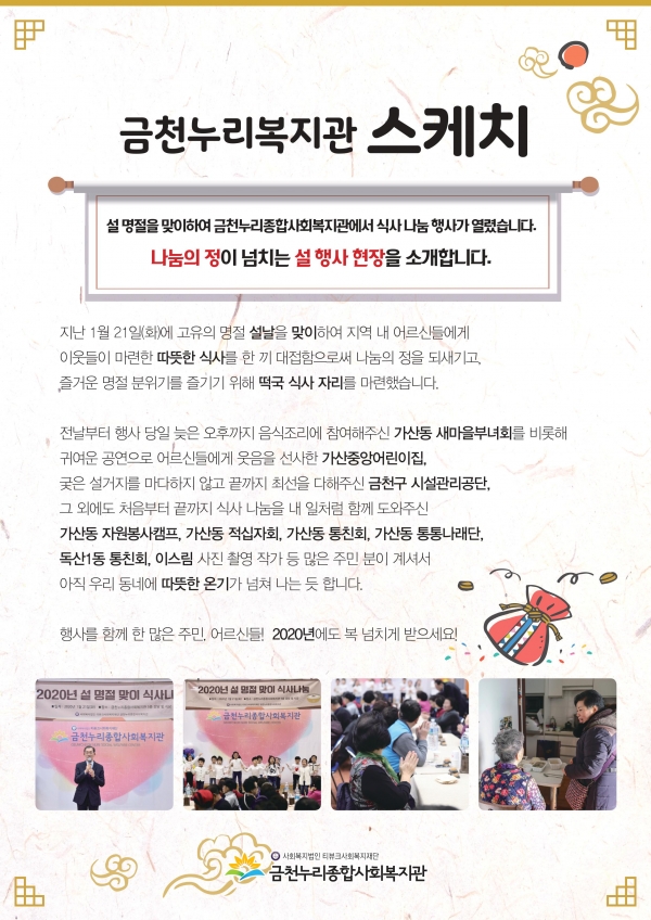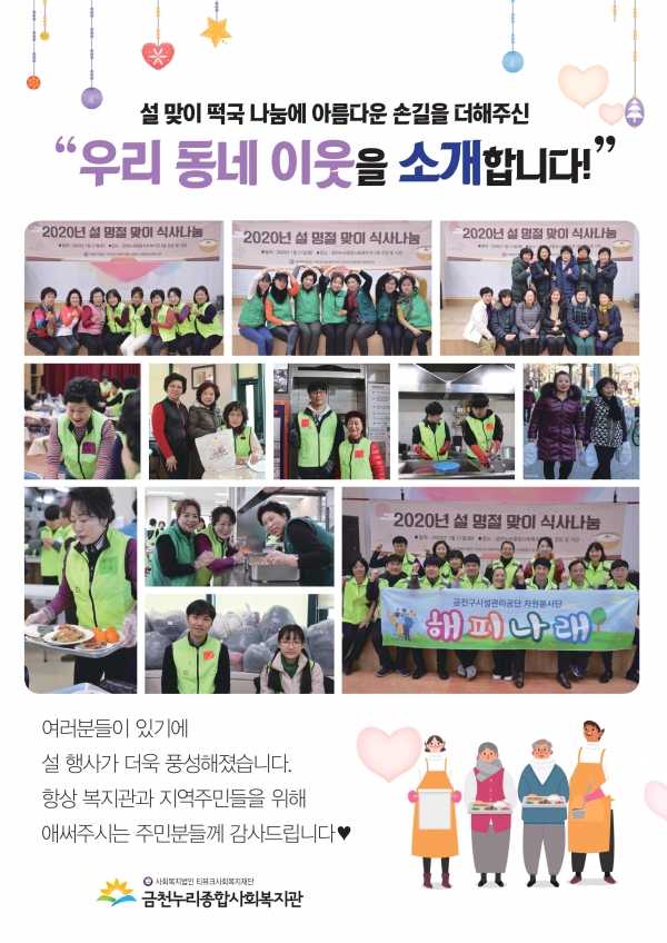 공지사항 프로그램 안내 이야기로 만나는 우리동네 영상으로 만나는 우리동네 미디어로 만나는 우리동네 사회복지사가 소개하는 우리동네 이야기로 만나는 우리동네 글과 사진을 통해 프로그램 후기 및 실천사례를 소개합니다. 이야기로 만나는 우리동네 [금천누리 스케치]설 맞이 떡국나눔 작성자관리자 조회2,257 작성일20-02-13 관련링크 본문 이전글 다음글 목록 2025년 하반기 2025년 상반기 2024년 하반기 2024년 상반기 2023년 하반기 X 개인정보처리방침 금천누리종합사회복지관 개인정보취급방침 금천누리종합사회복지관(이하 “복지관”이라 함)이 취급하는 모든 개인정보는 관련법령에 근거하거나 정보주체의 동의에 의하여 수집 · 보유와 처리되고 있습니다. 복지관 개인정보처리방침은 「개인정보 보호법」 에 근거를 두고 있으며, 이러한 법령의 규정에 따라 수집 · 보유와 처리하는 개인정보를 공공업무의 적절한 수행과 국민의 권익을 보호하기 위해 적법하고 적정하게 취급할 것입니다. 또한, 복지관은 관련 법령에서 규정한 바에 따라 보유하고 있는 개인정보에 대한 열람청구권과 정정청구권 등 여러분의 권익을 존중하며, 이와 관련한 고충을 신속하고 원활하게 처리할 수 있도록 하기 위하여 다음과 같이 개인정보처리방침을 수립 · 공개합니다. 제1조(개인정보의 처리목적) 복지관은 다음의 목적을 위하여 개인정보를 처리합니다. 처리하고 있는 개인정보는 다음의 목적 이외의 용도로는 이용되지 않으며, 이용목적이 변경될 경우에는 개인정보보호법 제18조에 따라 별도의 동의를 받는 등 필요한 조치를 이행할 예정입니다. 1. 자원봉사 신청 및 자원봉사자 관리 자원봉사 의사 확인, 봉사활동 실시를 위한 자원봉사자의 교육, 사회복지봉사활동인증관리시스템(VMS) 실적입력, 배치신청, 증명서 발급, 소식지 발송, 만 14세 미만 아동의 개인정보 수집 이용 시 법정대리인의 동의여부 확인, 각종 고지·통지, 고충처리, 통계자료 작성 등을 목적으로 개인정보를 처리합니다. 2. 후원 신청 및 후원자 관리 후원과 관련된 기본적인 본인 식별, 기부금 출금, 기부금영수증 발급과 국세청 연말정산간소화서비스로의 정보제공, CMS 신규/해지와 출금요청을 위한 정보제공(금융결제원), 만 14세 미만 아동의 개인정보 수집 이용 시 법정대리인의 동의여부 확인, 각종 고지·통지, 고충처리, 통계자료 작성 등을 목적으로 개인정보를 처리합니다. 3. 시설대관 및 기관방문 업무 운영과 관리 등을 목적으로 개인정보를 처리합니다. 제2조(개인정보의 처리와 보유기간) ① 복지관 법령에 따른 개인정보 보유 · 이용기간 또는 정보주체로부터 개인정보를 수집 시에 동의 받은 개인정보 보유 · 이용기간 내에서 개인정보를 처리 · 보유합니다. ② 통신비밀보호법 제15조의 2(전기통신사업자의 협조의무)에 따른 통신사실 확인자료 보관 - 가입자 전기통신일시, 개시 · 종료시간, 상대방 가입자번호, 사용도수, 발신기지국 위치추적자료 : 12개월 - 컴퓨터통신, 인터넷 로그기록자료, 접속지 추적자료 : 3개월 제3조(개인정보의 제3자 제공) ① 복지관은 정보주체의 개인정보를 제1조(개인정보의 처리 목적)에서 명시한 범위 내에서만 처리하며, 정보주체의 동의, 법률의 특별한 규정 등 개인정보 보호법 제17조에 해당하는 경우에만 개인정보를 제3자에게 제공합니다. ② 복지관은 정보주체로부터 개인정보를 수집 시에 동의 받은 내용 내에서 개인정보를 제3자에게 제공합니다. 제4조(정보주체의 권리 · 의무와 행사방법) ① 정보주체는 복지관에 대해 언제든지 다음 각 호의 개인정보보호 관련 권리를 행사할 수 있습니다. 1. 개인정보 열람요구 2. 오류 등이 있을 경우 정정 요구 3. 삭제요구 4. 처리정지 요구 ② 제1항에 따른 권리 행사는 복지관에 대해 서면, 전화, 전자우편, 모사전송(FAX)등을 통하여 하실 수 있으며 복지관은 이에 대해 지체 없이 조치하겠습니다. ③ 정보주체가 개인정보의 오류 등에 대한 정정 또는 삭제를 요구한 경우에는 복지관은 정정 또는 삭제를 완료할 때까지 당해 개인정보를 이용하거나 제공하지 않습니다. ④ 제1항에 따른 권리 행사는 정보주체의 법정대리인이나 위임을 받은 자 등 대리인을 통하여 하실 수 있습니다. 이 경우 개인정보 보호법 시행규칙 별지 제11호 서식에 따른 위임장을 제출하셔야 합니다. ⑤ 정보주체는 개인정보 보호법 등 관계법령을 위반하여 복지관이 처리하고 있는 정보주체 본인이나 타인의 개인정보와 사생활을 침해하여서는 아니됩니다. 제5조(처리하는 개인정보 항목) ① 복지관은 다음의 개인정보 항목을 처리하고 있습니다. * 필수정보: 이름, 생년월일, 연락처, 주소, 소속, 후원금액, 후원계좌 ② 인터넷 서비스 이용과정에서 아래 개인정보 항목이 자동으로 생성되어 수집될 수 있습니다. - IP주소, 쿠키, MAC주소, 서비스 이용기록, 방문기록, 불량 이용기록 등 제6조(개인정보의 파기) ① 복지관은 개인정보 보유기간의 경과, 처리목적 달성 등 개인정보가 불필요하게 되었을 때에는 지체 없이 해당 개인정보를 파기합니다. 제7조(개인정보의 안전성 확보조치) 복지관은 