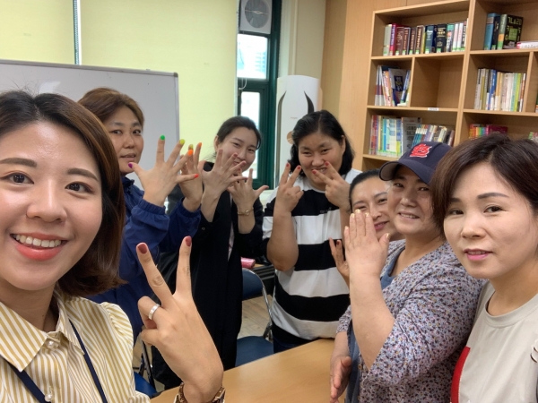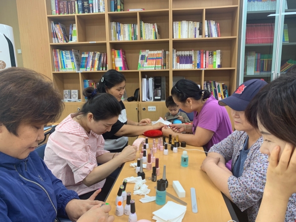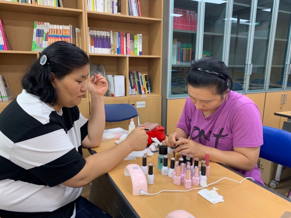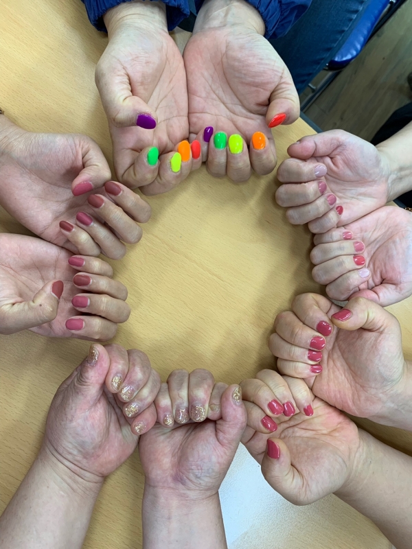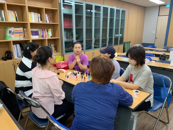 열심히 일 하시느라 거칠어진 손과 손톱을 곱게 다듬고, 각자 원하는 색깔을 선택하여 손톱에 칠해봅니다. 이야기를 도란도란 나누면서 서로의 손톱에 예쁘게 칠해주기도 해봤습니다.