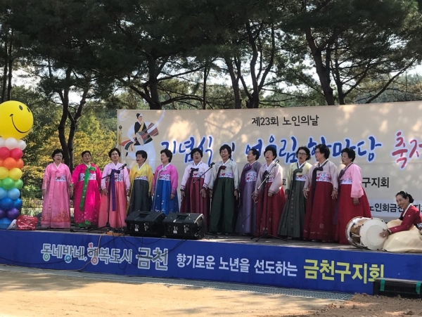 2019년 제 23회 노인의날 기념식 작성자조혜지 조회1,803 작성일19-10-10 관련링크 본문 2019년 제 23회 노인의날 기념식 10월8일(화)금천 체육공원에서 진행 되었습니다 . 노인의날 기념식 행사에 축하공연으로 금천누리종합사회복지관에서 진행하는 민요교실 회원분들의 아름다운 민요공연도 진행 되었습니다. 곱디고운 한복을 입으시고 하트 빠빵♥ 소녀소녀 같으신 민요교실 회원분들 두근두근~ 어르신 복지기여자 안수인 선생님과 노인사회활동지원사업에 참여하시는 모범어르신 이정자 구청상을 수상하셨습니다. 축하드립니다. 이전글 다음글 목록