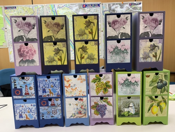 금천구꿈꾸는맘(mom) 자조모임 4회기 진행 작성자이진희 조회1,873 작성일19-04-23 관련링크 본문 <금천구 꿈꾸는 맘(mom) 자조모임 4회기> - 일시 : 2019년 4월 20일(토) 12:30~15:30 - 장소 : 금천누리복지관 3층 회의실 - 내용 : 냅킨아트 공예활동 '2단 서랍장' 만들기 짜잔- 작품이 완성되었습니다. 참여자들 각각의 취향에 맞는 서랍장이 완성되었어요. 금천구 꿈꾸는 맘들이 모여 자조모임 프로그램을 참여함으로써, 또다른 지역에서의 다양한 활동도 기대가 됩니다 : ) 이전글 다음글 목록