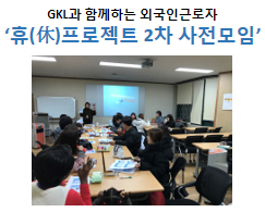 GKL과함께하는 휴(休)프로젝트2차사전모임 작성자관리자 조회1,579 작성일19-01-25 관련링크 본문 금천누리종합사회복지관 금천외국인근로자센터에서는 GKL사회공헌재단과 함께하는 외국인근로자 '휴(休)프로젝트 2차' 진행 전 사전모임의 시간을 가졌습니다. 사전 모임을 통해 여행 일정 안내, 준비 서류, 안전 수칙 등 공지할 수 있었으며 참여 외국인 가족 간 서로 인사할 수 있는 기회가 되었습니다. 휴(休)프로젝트 2차 여행도 관심있게 지켜봐주시면 감사하겠습니다. 이전글 다음글 목록