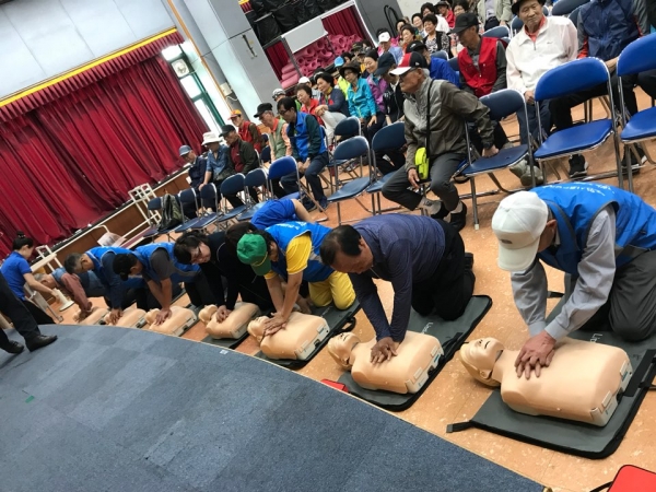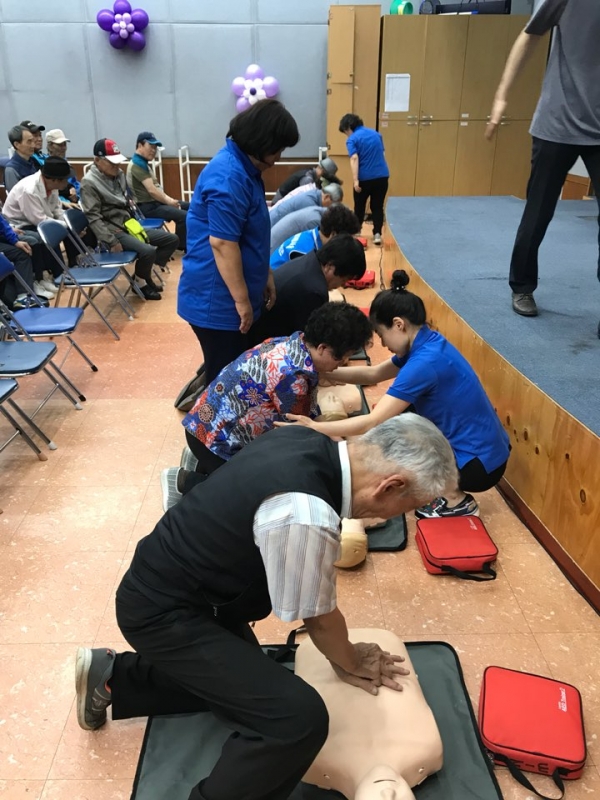심폐소생술을 어떻게 하는지 직접 사람모형에 가슴압박을 실시하여 위급상황시 당황하지 않고 직접 하실