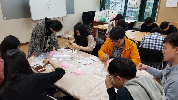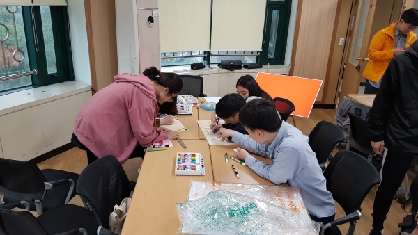 친구들이 실반지와 석고방향제, 홍보 판넬을 정성 들여 만들고