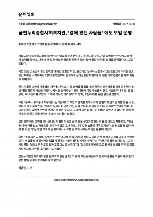공지사항 프로그램 안내 이야기로 만나는 우리동네 영상으로 만나는 우리동네 미디어로 만나는 우리동네 사회복지사가 소개하는 우리동네 미디어로 만나는 우리동네 미디어를 통해 티뷰크사회복지재단과 금천누리종합사회복지관을 소개합니다. Total 111건 6 페이지 [금천누리](웰페어이슈) 금천누리종합사회복지관, 중장년 1인 가구와 함께하는 '우리동네 지… http://www.welfareissue.com/news/articleView.html?idxno=15615 작성일2025-08-25 조회수263 [금천누리](한국사회복지저널) 금천구 독산4동, 복지관 ‘공간’ 통해 골목에 사람 모였다 https://www.ksw-news.com/news/articleView.html?idxno=3011043 작성일2025-07-30 조회수313 [금천누리](소셜임팩트뉴스) 하얀날개봉사단, 금천누리종합사회복지관 조리실 화구 기부해 https://www.socialimpactnews.net/news/articleView.html?idxno=4257 작성일2025-07-24 조회수305 [금천누리](전기신문) 따뜻한 이웃사랑으로 채워지는 식탁 https://www.electimes.com/news/articleView.html?idxno=358252 작성일2025-07-23 조회수270 [금천누리](소셜임팩트뉴스) 외로운 이웃 없는 금천구 만들기‘이웃ON’연합캠페인 성료 https://www.socialimpactnews.net/news/articleView.html?idxno=4247 작성일2025-07-23 조회수291 [금천누리](마을신문 금천in) 금천구 고립가구 전담기구 연합캠페인‘이웃ON’ 개최 https://www.gcinnews.com/news/articleView.html?idxno=12848 작성일2025-07-21 조회수273 [금천누리](국내매일) 금천구 고립가구 전담기구 연합캠페인‘이웃ON’ 개최 금천구 고립가구 전담기구 연합캠페인‘이웃ON’ 개최 – 국내매일 작성일2025-07-16 조회수280 [금천누리](마을신문 금천in) 금천구, 취약아동 위한 ‘학습환경 개선’ 3자 협약 체결…… https://www.gcinnews.com/news/articleView.html?idxno=12803 작성일2025-07-14 조회수292 [금천누리](에코저널) 금천누리종합사회복지관, 저탄소 생활실천 '그리니지' 진행 (에코저널) https://ecojournal.co.kr/m/view.php?idx=162414 작성일2025-06-30 조회수275 [금천누리](금천뉴스) 금천누리종합사회복지관, 그리니지(Green&Easy)와 함께하는 탄… http://www.gcnews.tv/news/articleView.html?idxno=21501 작성일2025-06-27 조회수252 [금천누리](에코저널) 금천누리종합사회복지관, '그리니지' 참여자 모집 (에코저널) https://www.ecojournal.co.kr/news/view.php?idx=162074 작성일2025-06-18 조회수254 [금천누리](문화일보, 사회복지신문) 금천누리종합사회복지관, 2025년 가정의 달 맞아 ‘… (문화일보) https://www.munhwa.com/article/11504749?ref=naver(사회복지신문) http://www.socialwelfarenews.com/news/view.php?idx=3933&sm=w_total&stx=%EA%B8%88%EC%B2%9C%EB%88%84%EB%A6%AC&stx2=&w_section1=&sdate=&edate= 작성일2025-05-16 조회수284 [금천누리](사회복지신문)금천누리종합사회복지관-㈜효돌, AI돌봄로봇으로 중장년 1인 가구 … http://www.socialwelfarenews.com/news/view.php?idx=3780&sm=w_total&stx=%ED%9A%A8%EB%8F%8C&stx2=&w_section1=&sdate=&edate= 작성일2025-04-16 조회수284 [금천누리](문화일보)금천누리종합사회복지관, ‘곁에 있던 사람들’ 애도 모임 운영 https://www.munhwa.com/news/view.html?no=2025041001039927107012 작성일2025-04-10 조회수274 [금천누리](웰페어이슈) 지역주민이 함께하는 마을잔치 "추억으로 남기는 5월 이야기" 보도… http://www.welfareissue.com/news/articleView.html?idxno=13914 작성일2024-05-21 조회수394 처음 이전 열린6페이지 7페이지 8페이지 맨끝 게시물 검색 검색대상 제목 내용 제목+내용 2025년 하반기 2025년 상반기 2024년 하반기 2024년 상반기 2023년 하반기 X 개인정보처리방침 금천누리종합사회복지관 개인정보취급방침 금천누리종합사회복지관(이하 “복지관”이라 함)이 취급하는 모든 개인정보는 관련법령에 근거하거나 정보주체의 동의에 의하여 수집 · 보유와 처리되고 있습니다. 복지관 개인정보처리방침은 「개인정보 보호법」 에 근거를 두고 있으며, 이러한 법령의 규정에 따라 수집 · 보유와 처리하는 개인정보를 공공업무의 적절한 수행과 국민의 권익을 보호하기 위해 적법하고 적정하게 취급할 것입니다. 또한, 복지관은 관련 법령에서 규정한 바에 따라 보유하고 있는 개인정보에 대한 열람청구권과 정정청구권 등 여러분의 권익을 존중하며, 이와 관련한 고충을 신속하고 원활하게 처리할 수 있도록 하기 위하여 다음과 같이 개인정보처리방침을 수립 · 공개합니다. 제1조(개인정보의 처리목적) 복지관은 다음의 목적을 위하여 개인정보를 처리합니다. 처리하고 있는 개인정보는 다음의 목적 이외의 용도로는 이용되지 않으며, 이용목적이 변경될 경우에는 개인정보보호법 제18조에 따라 별도의 동의를 받는 등 필요한 조치를 이행할 예정입니다. 1. 자원봉사 신청 및 자원봉사자 관리 자원봉사 의사 확인, 봉사활동 실시를 위한 자원봉사자의 교육, 사회복지봉사활동인증관리시스템(VMS) 실적입력, 배치신청, 증명서 발급, 소식지 발송, 만 14세 미만 아동의 개인정보 수집 이용 시 법정대리인의 동의여부 확인, 각종 고지·통지, 고충처리, 통계자료 작성 등을 목적으로 개인정보를 처리합니다. 2. 후원 신청 및 후원자 관리 후원과 관련된 기본적인 본인 식별, 기부금 출금, 기부금영수증 발급과 국세청 연말정산간소화서비스로의 정보제공, CMS 신규/해지와 출금요청을 위한 정보제공(금융결제