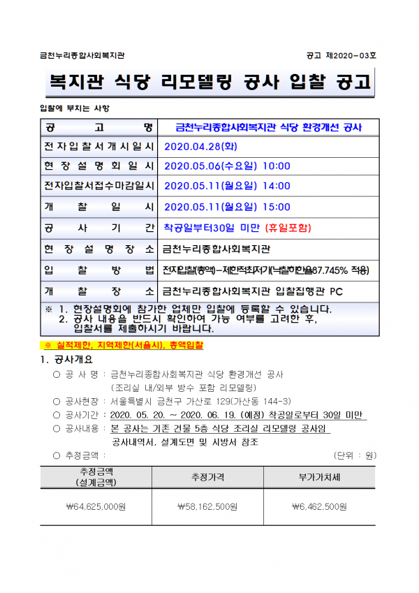 1. 제             목 :  2020년 기능보강사업 식당 환경개선 공사 입찰공고 게시