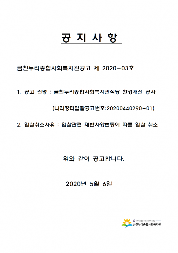 공지사항 프로그램 안내 이야기로 만나는 우리동네 영상으로 만나는 우리동네 미디어로 만나는 우리동네 사회복지사가 소개하는 우리동네 공지사항 공지사항 | 2020년 식당 환경개선 입찰 취소 공지 2020-05-06 관련링크 본문 이전글 다음글 수정 삭제 목록 2025년 하반기 2025년 상반기 2024년 하반기 2024년 상반기 2023년 하반기 X 개인정보처리방침 금천누리종합사회복지관 개인정보취급방침 금천누리종합사회복지관(이하 “복지관”이라 함)이 취급하는 모든 개인정보는 관련법령에 근거하거나 정보주체의 동의에 의하여 수집 · 보유와 처리되고 있습니다. 복지관 개인정보처리방침은 「개인정보 보호법」 에 근거를 두고 있으며, 이러한 법령의 규정에 따라 수집 · 보유와 처리하는 개인정보를 공공업무의 적절한 수행과 국민의 권익을 보호하기 위해 적법하고 적정하게 취급할 것입니다. 또한, 복지관은 관련 법령에서 규정한 바에 따라 보유하고 있는 개인정보에 대한 열람청구권과 정정청구권 등 여러분의 권익을 존중하며, 이와 관련한 고충을 신속하고 원활하게 처리할 수 있도록 하기 위하여 다음과 같이 개인정보처리방침을 수립 · 공개합니다. 제1조(개인정보의 처리목적) 복지관은 다음의 목적을 위하여 개인정보를 처리합니다. 처리하고 있는 개인정보는 다음의 목적 이외의 용도로는 이용되지 않으며, 이용목적이 변경될 경우에는 개인정보보호법 제18조에 따라 별도의 동의를 받는 등 필요한 조치를 이행할 예정입니다. 1. 자원봉사 신청 및 자원봉사자 관리 자원봉사 의사 확인, 봉사활동 실시를 위한 자원봉사자의 교육, 사회복지봉사활동인증관리시스템(VMS) 실적입력, 배치신청, 증명서 발급, 소식지 발송, 만 14세 미만 아동의 개인정보 수집 이용 시 법정대리인의 동의여부 확인, 각종 고지·통지, 고충처리, 통계자료 작성 등을 목적으로 개인정보를 처리합니다. 2. 후원 신청 및 후원자 관리 후원과 관련된 기본적인 본인 식별, 기부금 출금, 기부금영수증 발급과 국세청 연말정산간소화서비스로의 정보제공, CMS 신규/해지와 출금요청을 위한 정보제공(금융결제원), 만 14세 미만 아동의 개인정보 수집 이용 시 법정대리인의 동의여부 확인, 각종 고지·통지, 고충처리, 통계자료 작성 등을 목적으로 개인정보를 처리합니다. 3. 시설대관 및 기관방문 업무 운영과 관리 등을 목적으로 개인정보를 처리합니다. 제2조(개인정보의 처리와 보유기간) ① 복지관 법령에 따른 개인정보 보유 · 이용기간 또는 정보주체로부터 개인정보를 수집 시에 동의 받은 개인정보 보유 · 이용기간 내에서 개인정보를 처리 · 보유합니다. ② 통신비밀보호법 제15조의 2(전기통신사업자의 협조의무)에 따른 통신사실 확인자료 보관 - 가입자 전기통신일시, 개시 · 종료시간, 상대방 가입자번호, 사용도수, 발신기지국 위치추적자료 : 12개월 - 컴퓨터통신, 인터넷 로그기록자료, 접속지 추적자료 : 3개월 제3조(개인정보의 제3자 제공) ① 복지관은 정보주체의 개인정보를 제1조(개인정보의 처리 목적)에서 명시한 범위 내에서만 처리하며, 정보주체의 동의, 법률의 특별한 규정 등 개인정보 보호법 제17조에 해당하는 경우에만 개인정보를 제3자에게 제공합니다. ② 복지관은 정보주체로부터 개인정보를 수집 시에 동의 받은 내용 내에서 개인정보를 제3자에게 제공합니다. 제4조(정보주체의 권리 · 의무와 행사방법) ① 정보주체는 복지관에 대해 언제든지 다음 각 호의 개인정보보호 관련 권리를 행사할 수 있습니다. 1. 개인정보 열람요구 2. 오류 등이 있을 경우 정정 요구 3. 삭제요구 4. 처리정지 요구 ② 제1항에 따른 권리 행사는 복지관에 대해 서면, 전화, 전자우편, 모사전송(FAX)등을 통하여 하실 수 있으며 복지관은 이에 대해 지체 없이 조치하겠습니다. ③ 정보주체가 개인정보의 오류 등에 대한 정정 또는 삭제를 요구한 경우에는 복지관은 정정 또는 삭제를 완료할 때까지 당해 개인정보를 이용하거나 제공하지 않습니다. ④ 제1항에 따른 권리 행사는 정보주체의 법정대리인이나 위임을 받은 자 등 대리인을 통하여 하실 수 있습니다. 이 경우 개인정보 보호법 시행규칙 별지 제11호 서식에 따른 위임장을 제출하셔야 합니다. ⑤ 정보주체는 개인정보 보호법 등 관계법령을 위반하여 복지관이 처리하고 있는 정보주체 본인이나 타인의 개인정보와 사생활을 침해하여서는 아니됩니다. 제5조(처리하는 개인정보 항목) ① 복지관은 다음의 개인정보 항목을 처리하고 있습니다. * 필수정보: 이름, 생년월일, 연락처, 주소, 소속, 후원금액, 후원계좌 ② 인터넷 서비스 이용과정에서 아래 개인정보 항목이 자동으로 생성되어 수집될 수 있습니다. - IP주소, 쿠키, MAC주소, 서비스 이용기록, 방문기록, 불량 이용기록 등 제6조(개인정보의 파기) ① 복지관은 개인정보 보유기간의 경과, 처리목적 달성 등 개인정보가 불필요하게 되었을 때에는 지체 없이 해당 개인정보를 파기합니다. 제7조(개인정보의 안전성 확보조치) 복지관은 개인정보의 안전성 확보를 위해 다음과 같은 조치를 취하고 있습니다. 1. 관리적 조치 : 보안서버(SSL) 운영, 내부