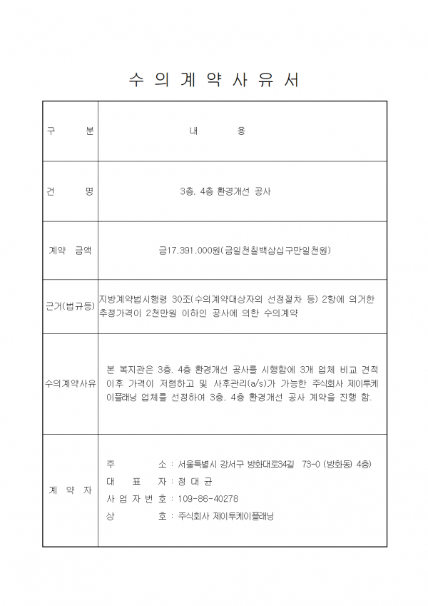 공지사항 프로그램 안내 이야기로 만나는 우리동네 영상으로 만나는 우리동네 미디어로 만나는 우리동네 사회복지사가 소개하는 우리동네 공지사항 공지사항 | 3층, 4층 환경개선공사 수의계약 공지 2019-11-05 관련링크 본문 이전글 다음글 수정 삭제 목록 2025년 하반기 2025년 상반기 2024년 하반기 2024년 상반기 2023년 하반기 X 개인정보처리방침 금천누리종합사회복지관 개인정보취급방침 금천누리종합사회복지관(이하 “복지관”이라 함)이 취급하는 모든 개인정보는 관련법령에 근거하거나 정보주체의 동의에 의하여 수집 · 보유와 처리되고 있습니다. 복지관 개인정보처리방침은 「개인정보 보호법」 에 근거를 두고 있으며, 이러한 법령의 규정에 따라 수집 · 보유와 처리하는 개인정보를 공공업무의 적절한 수행과 국민의 권익을 보호하기 위해 적법하고 적정하게 취급할 것입니다. 또한, 복지관은 관련 법령에서 규정한 바에 따라 보유하고 있는 개인정보에 대한 열람청구권과 정정청구권 등 여러분의 권익을 존중하며, 이와 관련한 고충을 신속하고 원활하게 처리할 수 있도록 하기 위하여 다음과 같이 개인정보처리방침을 수립 · 공개합니다. 제1조(개인정보의 처리목적) 복지관은 다음의 목적을 위하여 개인정보를 처리합니다. 처리하고 있는 개인정보는 다음의 목적 이외의 용도로는 이용되지 않으며, 이용목적이 변경될 경우에는 개인정보보호법 제18조에 따라 별도의 동의를 받는 등 필요한 조치를 이행할 예정입니다. 1. 자원봉사 신청 및 자원봉사자 관리 자원봉사 의사 확인, 봉사활동 실시를 위한 자원봉사자의 교육, 사회복지봉사활동인증관리시스템(VMS) 실적입력, 배치신청, 증명서 발급, 소식지 발송, 만 14세 미만 아동의 개인정보 수집 이용 시 법정대리인의 동의여부 확인, 각종 고지·통지, 고충처리, 통계자료 작성 등을 목적으로 개인정보를 처리합니다. 2. 후원 신청 및 후원자 관리 후원과 관련된 기본적인 본인 식별, 기부금 출금, 기부금영수증 발급과 국세청 연말정산간소화서비스로의 정보제공, CMS 신규/해지와 출금요청을 위한 정보제공(금융결제원), 만 14세 미만 아동의 개인정보 수집 이용 시 법정대리인의 동의여부 확인, 각종 고지·통지, 고충처리, 통계자료 작성 등을 목적으로 개인정보를 처리합니다. 3. 시설대관 및 기관방문 업무 운영과 관리 등을 목적으로 개인정보를 처리합니다. 제2조(개인정보의 처리와 보유기간) ① 복지관 법령에 따른 개인정보 보유 · 이용기간 또는 정보주체로부터 개인정보를 수집 시에 동의 받은 개인정보 보유 · 이용기간 내에서 개인정보를 처리 · 보유합니다. ② 통신비밀보호법 제15조의 2(전기통신사업자의 협조의무)에 따른 통신사실 확인자료 보관 - 가입자 전기통신일시, 개시 · 종료시간, 상대방 가입자번호, 사용도수, 발신기지국 위치추적자료 : 12개월 - 컴퓨터통신, 인터넷 로그기록자료, 접속지 추적자료 : 3개월 제3조(개인정보의 제3자 제공) ① 복지관은 정보주체의 개인정보를 제1조(개인정보의 처리 목적)에서 명시한 범위 내에서만 처리하며, 정보주체의 동의, 법률의 특별한 규정 등 개인정보 보호법 제17조에 해당하는 경우에만 개인정보를 제3자에게 제공합니다. ② 복지관은 정보주체로부터 개인정보를 수집 시에 동의 받은 내용 내에서 개인정보를 제3자에게 제공합니다. 제4조(정보주체의 권리 · 의무와 행사방법) ① 정보주체는 복지관에 대해 언제든지 다음 각 호의 개인정보보호 관련 권리를 행사할 수 있습니다. 1. 개인정보 열람요구 2. 오류 등이 있을 경우 정정 요구 3. 삭제요구 4. 처리정지 요구 ② 제1항에 따른 권리 행사는 복지관에 대해 서면, 전화, 전자우편, 모사전송(FAX)등을 통하여 하실 수 있으며 복지관은 이에 대해 지체 없이 조치하겠습니다. ③ 정보주체가 개인정보의 오류 등에 대한 정정 또는 삭제를 요구한 경우에는 복지관은 정정 또는 삭제를 완료할 때까지 당해 개인정보를 이용하거나 제공하지 않습니다. ④ 제1항에 따른 권리 행사는 정보주체의 법정대리인이나 위임을 받은 자 등 대리인을 통하여 하실 수 있습니다. 이 경우 개인정보 보호법 시행규칙 별지 제11호 서식에 따른 위임장을 제출하셔야 합니다. ⑤ 정보주체는 개인정보 보호법 등 관계법령을 위반하여 복지관이 처리하고 있는 정보주체 본인이나 타인의 개인정보와 사생활을 침해하여서는 아니됩니다. 제5조(처리하는 개인정보 항목) ① 복지관은 다음의 개인정보 항목을 처리하고 있습니다. * 필수정보: 이름, 생년월일, 연락처, 주소, 소속, 후원금액, 후원계좌 ② 인터넷 서비스 이용과정에서 아래 개인정보 항목이 자동으로 생성되어 수집될 수 있습니다. - IP주소, 쿠키, MAC주소, 서비스 이용기록, 방문기록, 불량 이용기록 등 제6조(개인정보의 파기) ① 복지관은 개인정보 보유기간의 경과, 처리목적 달성 등 개인정보가 불필요하게 되었을 때에는 지체 없이 해당 개인정보를 파기합니다. 제7조(개인정보의 안전성 확보조치) 복지관은 개인정보의 안전성 확보를 위해 다음과 같은 조치를 취하고 있습니다. 1. 관리적 조치 : 보안서버(SSL) 운영, 내