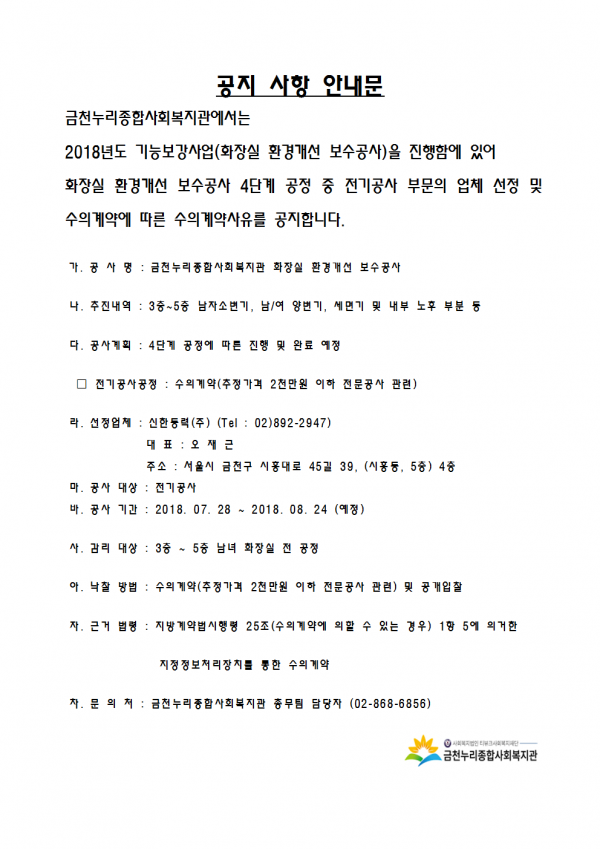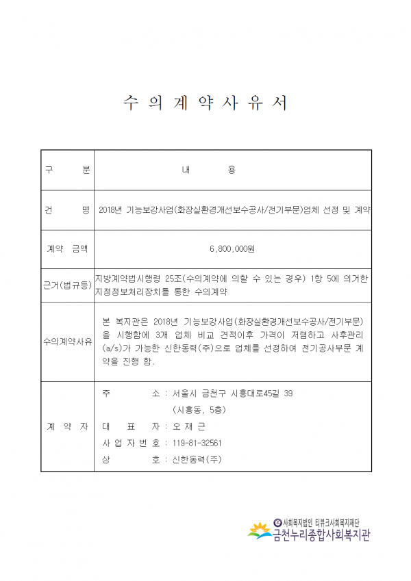 공지사항 프로그램 안내 이야기로 만나는 우리동네 영상으로 만나는 우리동네 미디어로 만나는 우리동네 사회복지사가 소개하는 우리동네 공지사항 공지사항 | 2018년도 기능보강사업 수의계약 공지(전기) 2018-07-28 관련링크 본문 이전글 다음글 수정 삭제 목록 2025년 하반기 2025년 상반기 2024년 하반기 2024년 상반기 2023년 하반기 X 개인정보처리방침 금천누리종합사회복지관 개인정보취급방침 금천누리종합사회복지관(이하 “복지관”이라 함)이 취급하는 모든 개인정보는 관련법령에 근거하거나 정보주체의 동의에 의하여 수집 · 보유와 처리되고 있습니다. 복지관 개인정보처리방침은 「개인정보 보호법」 에 근거를 두고 있으며, 이러한 법령의 규정에 따라 수집 · 보유와 처리하는 개인정보를 공공업무의 적절한 수행과 국민의 권익을 보호하기 위해 적법하고 적정하게 취급할 것입니다. 또한, 복지관은 관련 법령에서 규정한 바에 따라 보유하고 있는 개인정보에 대한 열람청구권과 정정청구권 등 여러분의 권익을 존중하며, 이와 관련한 고충을 신속하고 원활하게 처리할 수 있도록 하기 위하여 다음과 같이 개인정보처리방침을 수립 · 공개합니다. 제1조(개인정보의 처리목적) 복지관은 다음의 목적을 위하여 개인정보를 처리합니다. 처리하고 있는 개인정보는 다음의 목적 이외의 용도로는 이용되지 않으며, 이용목적이 변경될 경우에는 개인정보보호법 제18조에 따라 별도의 동의를 받는 등 필요한 조치를 이행할 예정입니다. 1. 자원봉사 신청 및 자원봉사자 관리 자원봉사 의사 확인, 봉사활동 실시를 위한 자원봉사자의 교육, 사회복지봉사활동인증관리시스템(VMS) 실적입력, 배치신청, 증명서 발급, 소식지 발송, 만 14세 미만 아동의 개인정보 수집 이용 시 법정대리인의 동의여부 확인, 각종 고지·통지, 고충처리, 통계자료 작성 등을 목적으로 개인정보를 처리합니다. 2. 후원 신청 및 후원자 관리 후원과 관련된 기본적인 본인 식별, 기부금 출금, 기부금영수증 발급과 국세청 연말정산간소화서비스로의 정보제공, CMS 신규/해지와 출금요청을 위한 정보제공(금융결제원), 만 14세 미만 아동의 개인정보 수집 이용 시 법정대리인의 동의여부 확인, 각종 고지·통지, 고충처리, 통계자료 작성 등을 목적으로 개인정보를 처리합니다. 3. 시설대관 및 기관방문 업무 운영과 관리 등을 목적으로 개인정보를 처리합니다. 제2조(개인정보의 처리와 보유기간) ① 복지관 법령에 따른 개인정보 보유 · 이용기간 또는 정보주체로부터 개인정보를 수집 시에 동의 받은 개인정보 보유 · 이용기간 내에서 개인정보를 처리 · 보유합니다. ② 통신비밀보호법 제15조의 2(전기통신사업자의 협조의무)에 따른 통신사실 확인자료 보관 - 가입자 전기통신일시, 개시 · 종료시간, 상대방 가입자번호, 사용도수, 발신기지국 위치추적자료 : 12개월 - 컴퓨터통신, 인터넷 로그기록자료, 접속지 추적자료 : 3개월 제3조(개인정보의 제3자 제공) ① 복지관은 정보주체의 개인정보를 제1조(개인정보의 처리 목적)에서 명시한 범위 내에서만 처리하며, 정보주체의 동의, 법률의 특별한 규정 등 개인정보 보호법 제17조에 해당하는 경우에만 개인정보를 제3자에게 제공합니다. ② 복지관은 정보주체로부터 개인정보를 수집 시에 동의 받은 내용 내에서 개인정보를 제3자에게 제공합니다. 제4조(정보주체의 권리 · 의무와 행사방법) ① 정보주체는 복지관에 대해 언제든지 다음 각 호의 개인정보보호 관련 권리를 행사할 수 있습니다. 1. 개인정보 열람요구 2. 오류 등이 있을 경우 정정 요구 3. 삭제요구 4. 처리정지 요구 ② 제1항에 따른 권리 행사는 복지관에 대해 서면, 전화, 전자우편, 모사전송(FAX)등을 통하여 하실 수 있으며 복지관은 이에 대해 지체 없이 조치하겠습니다. ③ 정보주체가 개인정보의 오류 등에 대한 정정 또는 삭제를 요구한 경우에는 복지관은 정정 또는 삭제를 완료할 때까지 당해 개인정보를 이용하거나 제공하지 않습니다. ④ 제1항에 따른 권리 행사는 정보주체의 법정대리인이나 위임을 받은 자 등 대리인을 통하여 하실 수 있습니다. 이 경우 개인정보 보호법 시행규칙 별지 제11호 서식에 따른 위임장을 제출하셔야 합니다. ⑤ 정보주체는 개인정보 보호법 등 관계법령을 위반하여 복지관이 처리하고 있는 정보주체 본인이나 타인의 개인정보와 사생활을 침해하여서는 아니됩니다. 제5조(처리하는 개인정보 항목) ① 복지관은 다음의 개인정보 항목을 처리하고 있습니다. * 필수정보: 이름, 생년월일, 연락처, 주소, 소속, 후원금액, 후원계좌 ② 인터넷 서비스 이용과정에서 아래 개인정보 항목이 자동으로 생성되어 수집될 수 있습니다. - IP주소, 쿠키, MAC주소, 서비스 이용기록, 방문기록, 불량 이용기록 등 제6조(개인정보의 파기) ① 복지관은 개인정보 보유기간의 경과, 처리목적 달성 등 개인정보가 불필요하게 되었을 때에는 지체 없이 해당 개인정보를 파기합니다. 제7조(개인정보의 안전성 확보조치) 복지관은 개인정보의 안전성 확보를 위해 다음과 같은 조치를 취하고 있습니다. 1. 관리적 조치 : 보안서버(SSL) 운