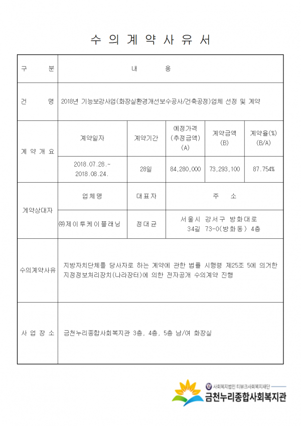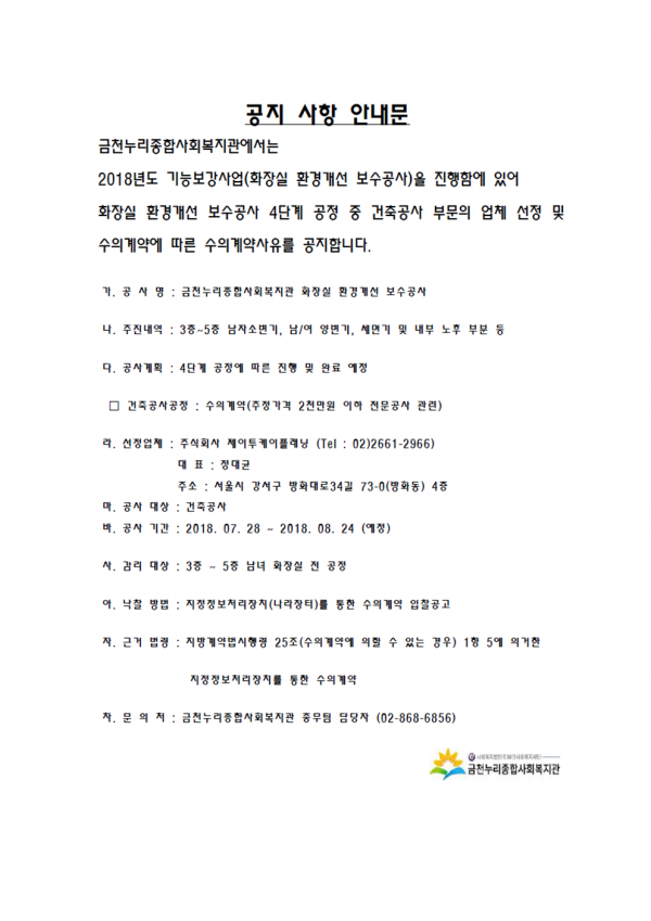 공지사항 프로그램 안내 이야기로 만나는 우리동네 영상으로 만나는 우리동네 미디어로 만나는 우리동네 사회복지사가 소개하는 우리동네 공지사항 공지사항 | 2018년도 기능보강사업 수의계약 공지(건축) 2018-09-03 관련링크 본문 이전글 다음글 수정 삭제 목록 2025년 하반기 2025년 상반기 2024년 하반기 2024년 상반기 2023년 하반기 X 개인정보처리방침 금천누리종합사회복지관 개인정보취급방침 금천누리종합사회복지관(이하 “복지관”이라 함)이 취급하는 모든 개인정보는 관련법령에 근거하거나 정보주체의 동의에 의하여 수집 · 보유와 처리되고 있습니다. 복지관 개인정보처리방침은 「개인정보 보호법」 에 근거를 두고 있으며, 이러한 법령의 규정에 따라 수집 · 보유와 처리하는 개인정보를 공공업무의 적절한 수행과 국민의 권익을 보호하기 위해 적법하고 적정하게 취급할 것입니다. 또한, 복지관은 관련 법령에서 규정한 바에 따라 보유하고 있는 개인정보에 대한 열람청구권과 정정청구권 등 여러분의 권익을 존중하며, 이와 관련한 고충을 신속하고 원활하게 처리할 수 있도록 하기 위하여 다음과 같이 개인정보처리방침을 수립 · 공개합니다. 제1조(개인정보의 처리목적) 복지관은 다음의 목적을 위하여 개인정보를 처리합니다. 처리하고 있는 개인정보는 다음의 목적 이외의 용도로는 이용되지 않으며, 이용목적이 변경될 경우에는 개인정보보호법 제18조에 따라 별도의 동의를 받는 등 필요한 조치를 이행할 예정입니다. 1. 자원봉사 신청 및 자원봉사자 관리 자원봉사 의사 확인, 봉사활동 실시를 위한 자원봉사자의 교육, 사회복지봉사활동인증관리시스템(VMS) 실적입력, 배치신청, 증명서 발급, 소식지 발송, 만 14세 미만 아동의 개인정보 수집 이용 시 법정대리인의 동의여부 확인, 각종 고지·통지, 고충처리, 통계자료 작성 등을 목적으로 개인정보를 처리합니다. 2. 후원 신청 및 후원자 관리 후원과 관련된 기본적인 본인 식별, 기부금 출금, 기부금영수증 발급과 국세청 연말정산간소화서비스로의 정보제공, CMS 신규/해지와 출금요청을 위한 정보제공(금융결제원), 만 14세 미만 아동의 개인정보 수집 이용 시 법정대리인의 동의여부 확인, 각종 고지·통지, 고충처리, 통계자료 작성 등을 목적으로 개인정보를 처리합니다. 3. 시설대관 및 기관방문 업무 운영과 관리 등을 목적으로 개인정보를 처리합니다. 제2조(개인정보의 처리와 보유기간) ① 복지관 법령에 따른 개인정보 보유 · 이용기간 또는 정보주체로부터 개인정보를 수집 시에 동의 받은 개인정보 보유 · 이용기간 내에서 개인정보를 처리 · 보유합니다. ② 통신비밀보호법 제15조의 2(전기통신사업자의 협조의무)에 따른 통신사실 확인자료 보관 - 가입자 전기통신일시, 개시 · 종료시간, 상대방 가입자번호, 사용도수, 발신기지국 위치추적자료 : 12개월 - 컴퓨터통신, 인터넷 로그기록자료, 접속지 추적자료 : 3개월 제3조(개인정보의 제3자 제공) ① 복지관은 정보주체의 개인정보를 제1조(개인정보의 처리 목적)에서 명시한 범위 내에서만 처리하며, 정보주체의 동의, 법률의 특별한 규정 등 개인정보 보호법 제17조에 해당하는 경우에만 개인정보를 제3자에게 제공합니다. ② 복지관은 정보주체로부터 개인정보를 수집 시에 동의 받은 내용 내에서 개인정보를 제3자에게 제공합니다. 제4조(정보주체의 권리 · 의무와 행사방법) ① 정보주체는 복지관에 대해 언제든지 다음 각 호의 개인정보보호 관련 권리를 행사할 수 있습니다. 1. 개인정보 열람요구 2. 오류 등이 있을 경우 정정 요구 3. 삭제요구 4. 처리정지 요구 ② 제1항에 따른 권리 행사는 복지관에 대해 서면, 전화, 전자우편, 모사전송(FAX)등을 통하여 하실 수 있으며 복지관은 이에 대해 지체 없이 조치하겠습니다. ③ 정보주체가 개인정보의 오류 등에 대한 정정 또는 삭제를 요구한 경우에는 복지관은 정정 또는 삭제를 완료할 때까지 당해 개인정보를 이용하거나 제공하지 않습니다. ④ 제1항에 따른 권리 행사는 정보주체의 법정대리인이나 위임을 받은 자 등 대리인을 통하여 하실 수 있습니다. 이 경우 개인정보 보호법 시행규칙 별지 제11호 서식에 따른 위임장을 제출하셔야 합니다. ⑤ 정보주체는 개인정보 보호법 등 관계법령을 위반하여 복지관이 처리하고 있는 정보주체 본인이나 타인의 개인정보와 사생활을 침해하여서는 아니됩니다. 제5조(처리하는 개인정보 항목) ① 복지관은 다음의 개인정보 항목을 처리하고 있습니다. * 필수정보: 이름, 생년월일, 연락처, 주소, 소속, 후원금액, 후원계좌 ② 인터넷 서비스 이용과정에서 아래 개인정보 항목이 자동으로 생성되어 수집될 수 있습니다. - IP주소, 쿠키, MAC주소, 서비스 이용기록, 방문기록, 불량 이용기록 등 제6조(개인정보의 파기) ① 복지관은 개인정보 보유기간의 경과, 처리목적 달성 등 개인정보가 불필요하게 되었을 때에는 지체 없이 해당 개인정보를 파기합니다. 제7조(개인정보의 안전성 확보조치) 복지관은 개인정보의 안전성 확보를 위해 다음과 같은 조치를 취하고 있습니다. 1. 관리적 조치 : 보안서버(SSL) 운