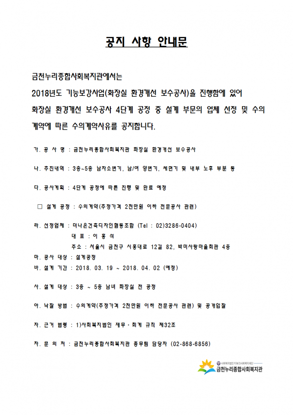 공지사항 | 2018년도 기능보강사업 수의계약 공지(설계) 2018-03-20 첨부파일 수의계약사유서.pdf (212.5K) 84회 다운로드 DATE : 2018-03-00 00:00:00 관련링크 본문 이전글 다음글 수정 삭제 목록