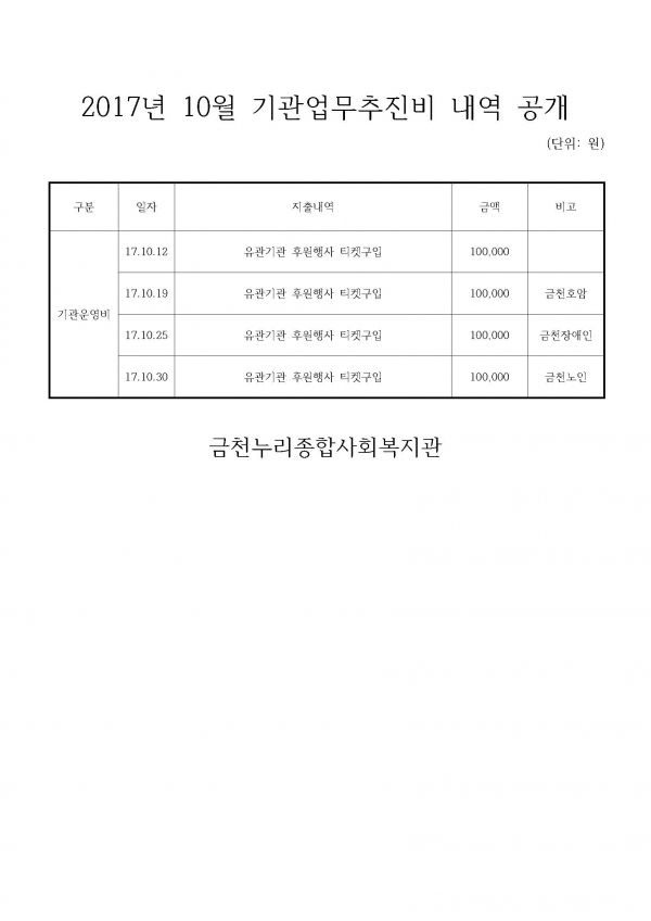 공지사항 프로그램 안내 이야기로 만나는 우리동네 영상으로 만나는 우리동네 미디어로 만나는 우리동네 사회복지사가 소개하는 우리동네 공지사항 예산 공시 | 2017년 10월 기관업무추진비 내역 공개 2017-11-03 관련링크 본문 이전글 다음글 수정 삭제 목록 2025년 하반기 2025년 상반기 2024년 하반기 2024년 상반기 2023년 하반기 X 개인정보처리방침 금천누리종합사회복지관 개인정보취급방침 금천누리종합사회복지관(이하 “복지관”이라 함)이 취급하는 모든 개인정보는 관련법령에 근거하거나 정보주체의 동의에 의하여 수집 · 보유와 처리되고 있습니다. 복지관 개인정보처리방침은 「개인정보 보호법」 에 근거를 두고 있으며, 이러한 법령의 규정에 따라 수집 · 보유와 처리하는 개인정보를 공공업무의 적절한 수행과 국민의 권익을 보호하기 위해 적법하고 적정하게 취급할 것입니다. 또한, 복지관은 관련 법령에서 규정한 바에 따라 보유하고 있는 개인정보에 대한 열람청구권과 정정청구권 등 여러분의 권익을 존중하며, 이와 관련한 고충을 신속하고 원활하게 처리할 수 있도록 하기 위하여 다음과 같이 개인정보처리방침을 수립 · 공개합니다. 제1조(개인정보의 처리목적) 복지관은 다음의 목적을 위하여 개인정보를 처리합니다. 처리하고 있는 개인정보는 다음의 목적 이외의 용도로는 이용되지 않으며, 이용목적이 변경될 경우에는 개인정보보호법 제18조에 따라 별도의 동의를 받는 등 필요한 조치를 이행할 예정입니다. 1. 자원봉사 신청 및 자원봉사자 관리 자원봉사 의사 확인, 봉사활동 실시를 위한 자원봉사자의 교육, 사회복지봉사활동인증관리시스템(VMS) 실적입력, 배치신청, 증명서 발급, 소식지 발송, 만 14세 미만 아동의 개인정보 수집 이용 시 법정대리인의 동의여부 확인, 각종 고지·통지, 고충처리, 통계자료 작성 등을 목적으로 개인정보를 처리합니다. 2. 후원 신청 및 후원자 관리 후원과 관련된 기본적인 본인 식별, 기부금 출금, 기부금영수증 발급과 국세청 연말정산간소화서비스로의 정보제공, CMS 신규/해지와 출금요청을 위한 정보제공(금융결제원), 만 14세 미만 아동의 개인정보 수집 이용 시 법정대리인의 동의여부 확인, 각종 고지·통지, 고충처리, 통계자료 작성 등을 목적으로 개인정보를 처리합니다. 3. 시설대관 및 기관방문 업무 운영과 관리 등을 목적으로 개인정보를 처리합니다. 제2조(개인정보의 처리와 보유기간) ① 복지관 법령에 따른 개인정보 보유 · 이용기간 또는 정보주체로부터 개인정보를 수집 시에 동의 받은 개인정보 보유 · 이용기간 내에서 개인정보를 처리 · 보유합니다. ② 통신비밀보호법 제15조의 2(전기통신사업자의 협조의무)에 따른 통신사실 확인자료 보관 - 가입자 전기통신일시, 개시 · 종료시간, 상대방 가입자번호, 사용도수, 발신기지국 위치추적자료 : 12개월 - 컴퓨터통신, 인터넷 로그기록자료, 접속지 추적자료 : 3개월 제3조(개인정보의 제3자 제공) ① 복지관은 정보주체의 개인정보를 제1조(개인정보의 처리 목적)에서 명시한 범위 내에서만 처리하며, 정보주체의 동의, 법률의 특별한 규정 등 개인정보 보호법 제17조에 해당하는 경우에만 개인정보를 제3자에게 제공합니다. ② 복지관은 정보주체로부터 개인정보를 수집 시에 동의 받은 내용 내에서 개인정보를 제3자에게 제공합니다. 제4조(정보주체의 권리 · 의무와 행사방법) ① 정보주체는 복지관에 대해 언제든지 다음 각 호의 개인정보보호 관련 권리를 행사할 수 있습니다. 1. 개인정보 열람요구 2. 오류 등이 있을 경우 정정 요구 3. 삭제요구 4. 처리정지 요구 ② 제1항에 따른 권리 행사는 복지관에 대해 서면, 전화, 전자우편, 모사전송(FAX)등을 통하여 하실 수 있으며 복지관은 이에 대해 지체 없이 조치하겠습니다. ③ 정보주체가 개인정보의 오류 등에 대한 정정 또는 삭제를 요구한 경우에는 복지관은 정정 또는 삭제를 완료할 때까지 당해 개인정보를 이용하거나 제공하지 않습니다. ④ 제1항에 따른 권리 행사는 정보주체의 법정대리인이나 위임을 받은 자 등 대리인을 통하여 하실 수 있습니다. 이 경우 개인정보 보호법 시행규칙 별지 제11호 서식에 따른 위임장을 제출하셔야 합니다. ⑤ 정보주체는 개인정보 보호법 등 관계법령을 위반하여 복지관이 처리하고 있는 정보주체 본인이나 타인의 개인정보와 사생활을 침해하여서는 아니됩니다. 제5조(처리하는 개인정보 항목) ① 복지관은 다음의 개인정보 항목을 처리하고 있습니다. * 필수정보: 이름, 생년월일, 연락처, 주소, 소속, 후원금액, 후원계좌 ② 인터넷 서비스 이용과정에서 아래 개인정보 항목이 자동으로 생성되어 수집될 수 있습니다. - IP주소, 쿠키, MAC주소, 서비스 이용기록, 방문기록, 불량 이용기록 등 제6조(개인정보의 파기) ① 복지관은 개인정보 보유기간의 경과, 처리목적 달성 등 개인정보가 불필요하게 되었을 때에는 지체 없이 해당 개인정보를 파기합니다. 제7조(개인정보의 안전성 확보조치) 복지관은 개인정보의 안전성 확보를 위해 다음과 같은 조치를 취하고 있습니다. 1. 관리적 조치 : 보안서버(SSL) 운영, 내