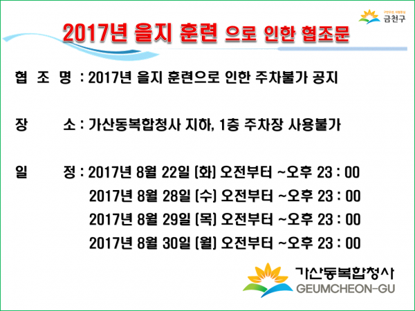 공지사항 프로그램 안내 이야기로 만나는 우리동네 영상으로 만나는 우리동네 미디어로 만나는 우리동네 사회복지사가 소개하는 우리동네 공지사항 공지사항 | 2017년 을지훈련에 따른 관내 주차금지 2017-08-22 관련링크 본문 이전글 다음글 수정 삭제 목록 2025년 하반기 2025년 상반기 2024년 하반기 2024년 상반기 2023년 하반기 X 개인정보처리방침 금천누리종합사회복지관 개인정보취급방침 금천누리종합사회복지관(이하 “복지관”이라 함)이 취급하는 모든 개인정보는 관련법령에 근거하거나 정보주체의 동의에 의하여 수집 · 보유와 처리되고 있습니다. 복지관 개인정보처리방침은 「개인정보 보호법」 에 근거를 두고 있으며, 이러한 법령의 규정에 따라 수집 · 보유와 처리하는 개인정보를 공공업무의 적절한 수행과 국민의 권익을 보호하기 위해 적법하고 적정하게 취급할 것입니다. 또한, 복지관은 관련 법령에서 규정한 바에 따라 보유하고 있는 개인정보에 대한 열람청구권과 정정청구권 등 여러분의 권익을 존중하며, 이와 관련한 고충을 신속하고 원활하게 처리할 수 있도록 하기 위하여 다음과 같이 개인정보처리방침을 수립 · 공개합니다. 제1조(개인정보의 처리목적) 복지관은 다음의 목적을 위하여 개인정보를 처리합니다. 처리하고 있는 개인정보는 다음의 목적 이외의 용도로는 이용되지 않으며, 이용목적이 변경될 경우에는 개인정보보호법 제18조에 따라 별도의 동의를 받는 등 필요한 조치를 이행할 예정입니다. 1. 자원봉사 신청 및 자원봉사자 관리 자원봉사 의사 확인, 봉사활동 실시를 위한 자원봉사자의 교육, 사회복지봉사활동인증관리시스템(VMS) 실적입력, 배치신청, 증명서 발급, 소식지 발송, 만 14세 미만 아동의 개인정보 수집 이용 시 법정대리인의 동의여부 확인, 각종 고지·통지, 고충처리, 통계자료 작성 등을 목적으로 개인정보를 처리합니다. 2. 후원 신청 및 후원자 관리 후원과 관련된 기본적인 본인 식별, 기부금 출금, 기부금영수증 발급과 국세청 연말정산간소화서비스로의 정보제공, CMS 신규/해지와 출금요청을 위한 정보제공(금융결제원), 만 14세 미만 아동의 개인정보 수집 이용 시 법정대리인의 동의여부 확인, 각종 고지·통지, 고충처리, 통계자료 작성 등을 목적으로 개인정보를 처리합니다. 3. 시설대관 및 기관방문 업무 운영과 관리 등을 목적으로 개인정보를 처리합니다. 제2조(개인정보의 처리와 보유기간) ① 복지관 법령에 따른 개인정보 보유 · 이용기간 또는 정보주체로부터 개인정보를 수집 시에 동의 받은 개인정보 보유 · 이용기간 내에서 개인정보를 처리 · 보유합니다. ② 통신비밀보호법 제15조의 2(전기통신사업자의 협조의무)에 따른 통신사실 확인자료 보관 - 가입자 전기통신일시, 개시 · 종료시간, 상대방 가입자번호, 사용도수, 발신기지국 위치추적자료 : 12개월 - 컴퓨터통신, 인터넷 로그기록자료, 접속지 추적자료 : 3개월 제3조(개인정보의 제3자 제공) ① 복지관은 정보주체의 개인정보를 제1조(개인정보의 처리 목적)에서 명시한 범위 내에서만 처리하며, 정보주체의 동의, 법률의 특별한 규정 등 개인정보 보호법 제17조에 해당하는 경우에만 개인정보를 제3자에게 제공합니다. ② 복지관은 정보주체로부터 개인정보를 수집 시에 동의 받은 내용 내에서 개인정보를 제3자에게 제공합니다. 제4조(정보주체의 권리 · 의무와 행사방법) ① 정보주체는 복지관에 대해 언제든지 다음 각 호의 개인정보보호 관련 권리를 행사할 수 있습니다. 1. 개인정보 열람요구 2. 오류 등이 있을 경우 정정 요구 3. 삭제요구 4. 처리정지 요구 ② 제1항에 따른 권리 행사는 복지관에 대해 서면, 전화, 전자우편, 모사전송(FAX)등을 통하여 하실 수 있으며 복지관은 이에 대해 지체 없이 조치하겠습니다. ③ 정보주체가 개인정보의 오류 등에 대한 정정 또는 삭제를 요구한 경우에는 복지관은 정정 또는 삭제를 완료할 때까지 당해 개인정보를 이용하거나 제공하지 않습니다. ④ 제1항에 따른 권리 행사는 정보주체의 법정대리인이나 위임을 받은 자 등 대리인을 통하여 하실 수 있습니다. 이 경우 개인정보 보호법 시행규칙 별지 제11호 서식에 따른 위임장을 제출하셔야 합니다. ⑤ 정보주체는 개인정보 보호법 등 관계법령을 위반하여 복지관이 처리하고 있는 정보주체 본인이나 타인의 개인정보와 사생활을 침해하여서는 아니됩니다. 제5조(처리하는 개인정보 항목) ① 복지관은 다음의 개인정보 항목을 처리하고 있습니다. * 필수정보: 이름, 생년월일, 연락처, 주소, 소속, 후원금액, 후원계좌 ② 인터넷 서비스 이용과정에서 아래 개인정보 항목이 자동으로 생성되어 수집될 수 있습니다. - IP주소, 쿠키, MAC주소, 서비스 이용기록, 방문기록, 불량 이용기록 등 제6조(개인정보의 파기) ① 복지관은 개인정보 보유기간의 경과, 처리목적 달성 등 개인정보가 불필요하게 되었을 때에는 지체 없이 해당 개인정보를 파기합니다. 제7조(개인정보의 안전성 확보조치) 복지관은 개인정보의 안전성 확보를 위해 다음과 같은 조치를 취하고 있습니다. 1. 관리적 조치 : 보안서버(SSL) 운영, 내