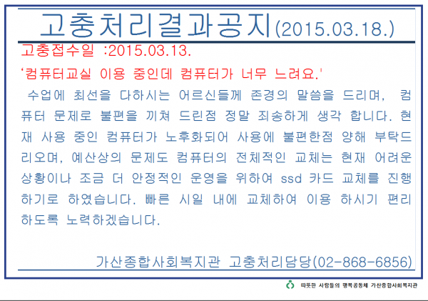 공지사항 프로그램 안내 이야기로 만나는 우리동네 영상으로 만나는 우리동네 미디어로 만나는 우리동네 사회복지사가 소개하는 우리동네 공지사항 공지사항 | 고충처리결과공지(2015.03.13) 2015-03-13 관련링크 본문 이전글 다음글 수정 삭제 목록 2025년 하반기 2025년 상반기 2024년 하반기 2024년 상반기 2023년 하반기 X 개인정보처리방침 금천누리종합사회복지관 개인정보취급방침 금천누리종합사회복지관(이하 “복지관”이라 함)이 취급하는 모든 개인정보는 관련법령에 근거하거나 정보주체의 동의에 의하여 수집 · 보유와 처리되고 있습니다. 복지관 개인정보처리방침은 「개인정보 보호법」 에 근거를 두고 있으며, 이러한 법령의 규정에 따라 수집 · 보유와 처리하는 개인정보를 공공업무의 적절한 수행과 국민의 권익을 보호하기 위해 적법하고 적정하게 취급할 것입니다. 또한, 복지관은 관련 법령에서 규정한 바에 따라 보유하고 있는 개인정보에 대한 열람청구권과 정정청구권 등 여러분의 권익을 존중하며, 이와 관련한 고충을 신속하고 원활하게 처리할 수 있도록 하기 위하여 다음과 같이 개인정보처리방침을 수립 · 공개합니다. 제1조(개인정보의 처리목적) 복지관은 다음의 목적을 위하여 개인정보를 처리합니다. 처리하고 있는 개인정보는 다음의 목적 이외의 용도로는 이용되지 않으며, 이용목적이 변경될 경우에는 개인정보보호법 제18조에 따라 별도의 동의를 받는 등 필요한 조치를 이행할 예정입니다. 1. 자원봉사 신청 및 자원봉사자 관리 자원봉사 의사 확인, 봉사활동 실시를 위한 자원봉사자의 교육, 사회복지봉사활동인증관리시스템(VMS) 실적입력, 배치신청, 증명서 발급, 소식지 발송, 만 14세 미만 아동의 개인정보 수집 이용 시 법정대리인의 동의여부 확인, 각종 고지·통지, 고충처리, 통계자료 작성 등을 목적으로 개인정보를 처리합니다. 2. 후원 신청 및 후원자 관리 후원과 관련된 기본적인 본인 식별, 기부금 출금, 기부금영수증 발급과 국세청 연말정산간소화서비스로의 정보제공, CMS 신규/해지와 출금요청을 위한 정보제공(금융결제원), 만 14세 미만 아동의 개인정보 수집 이용 시 법정대리인의 동의여부 확인, 각종 고지·통지, 고충처리, 통계자료 작성 등을 목적으로 개인정보를 처리합니다. 3. 시설대관 및 기관방문 업무 운영과 관리 등을 목적으로 개인정보를 처리합니다. 제2조(개인정보의 처리와 보유기간) ① 복지관 법령에 따른 개인정보 보유 · 이용기간 또는 정보주체로부터 개인정보를 수집 시에 동의 받은 개인정보 보유 · 이용기간 내에서 개인정보를 처리 · 보유합니다. ② 통신비밀보호법 제15조의 2(전기통신사업자의 협조의무)에 따른 통신사실 확인자료 보관 - 가입자 전기통신일시, 개시 · 종료시간, 상대방 가입자번호, 사용도수, 발신기지국 위치추적자료 : 12개월 - 컴퓨터통신, 인터넷 로그기록자료, 접속지 추적자료 : 3개월 제3조(개인정보의 제3자 제공) ① 복지관은 정보주체의 개인정보를 제1조(개인정보의 처리 목적)에서 명시한 범위 내에서만 처리하며, 정보주체의 동의, 법률의 특별한 규정 등 개인정보 보호법 제17조에 해당하는 경우에만 개인정보를 제3자에게 제공합니다. ② 복지관은 정보주체로부터 개인정보를 수집 시에 동의 받은 내용 내에서 개인정보를 제3자에게 제공합니다. 제4조(정보주체의 권리 · 의무와 행사방법) ① 정보주체는 복지관에 대해 언제든지 다음 각 호의 개인정보보호 관련 권리를 행사할 수 있습니다. 1. 개인정보 열람요구 2. 오류 등이 있을 경우 정정 요구 3. 삭제요구 4. 처리정지 요구 ② 제1항에 따른 권리 행사는 복지관에 대해 서면, 전화, 전자우편, 모사전송(FAX)등을 통하여 하실 수 있으며 복지관은 이에 대해 지체 없이 조치하겠습니다. ③ 정보주체가 개인정보의 오류 등에 대한 정정 또는 삭제를 요구한 경우에는 복지관은 정정 또는 삭제를 완료할 때까지 당해 개인정보를 이용하거나 제공하지 않습니다. ④ 제1항에 따른 권리 행사는 정보주체의 법정대리인이나 위임을 받은 자 등 대리인을 통하여 하실 수 있습니다. 이 경우 개인정보 보호법 시행규칙 별지 제11호 서식에 따른 위임장을 제출하셔야 합니다. ⑤ 정보주체는 개인정보 보호법 등 관계법령을 위반하여 복지관이 처리하고 있는 정보주체 본인이나 타인의 개인정보와 사생활을 침해하여서는 아니됩니다. 제5조(처리하는 개인정보 항목) ① 복지관은 다음의 개인정보 항목을 처리하고 있습니다. * 필수정보: 이름, 생년월일, 연락처, 주소, 소속, 후원금액, 후원계좌 ② 인터넷 서비스 이용과정에서 아래 개인정보 항목이 자동으로 생성되어 수집될 수 있습니다. - IP주소, 쿠키, MAC주소, 서비스 이용기록, 방문기록, 불량 이용기록 등 제6조(개인정보의 파기) ① 복지관은 개인정보 보유기간의 경과, 처리목적 달성 등 개인정보가 불필요하게 되었을 때에는 지체 없이 해당 개인정보를 파기합니다. 제7조(개인정보의 안전성 확보조치) 복지관은 개인정보의 안전성 확보를 위해 다음과 같은 조치를 취하고 있습니다. 1. 관리적 조치 : 보안서버(SSL) 운영, 내부관리계획