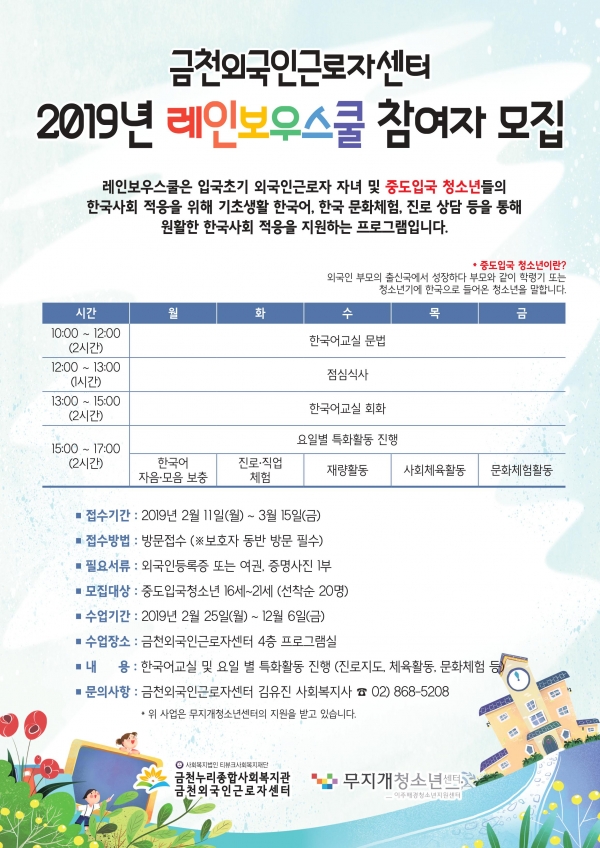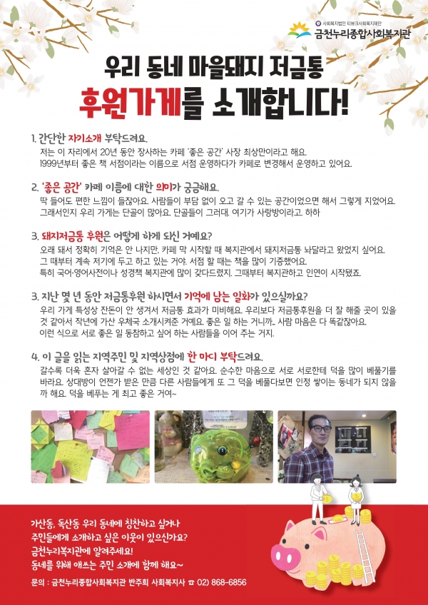 2019년 3월의 금천누리종합사회복지관 2019-02-27 관련링크 본문 금천누리종합사회복지관 2019년 3월 소식입니다. 복지관 마을돼지 저금통 상점이자 우리동네 사랑방인 카페 '좋은공간'의 인터뷰와 금천외국인근로자센터 레인보우스쿨 참여자모집 안내 소식입니다. 3월의 복지관 소식 및 동네 이야기에 많은 관심 가져주셔서 감사합니다!! 이전글 다음글 수정 삭제 목록