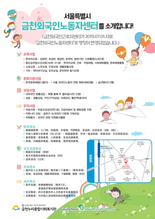 2019년 8월의 금천누리종합사회복지관 2019-07-25 관련링크 본문 금천누리종합사회복지관 2019년 8월 소식입니다. 이번 달 우리 기관 소식은 복지관 공사로 인한 8월 프로그램 일부 휴강 안내와 여름방학특강 및 청소년진로탐색 프로그램 '두드림' 참여자 모집 안내 등이 있습니다. 8월의 복지관 소식 및 동네 이야기에 많은 관심 가져주셔서 감사합니다. 무더운 여름 시원하게 이겨내시고 행복한 여름휴가 보내세요~ 이전글 다음글 수정 삭제 목록