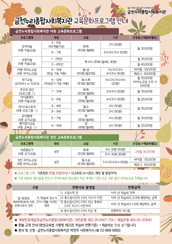 공지사항 프로그램 안내 이야기로 만나는 우리동네 영상으로 만나는 우리동네 미디어로 만나는 우리동네 사회복지사가 소개하는 우리동네 프로그램 안내 금천누리종합사회복지관에서 진행하는 다양한 프로그램을 안내해드립니다. 2018년 11월의 금천누리종합사회복지관 2018-11-02 관련링크 본문 금천누리종합사회복지관 11월 소식입니다. 11월의 금천누리복지관은 아동교육문화프로그램 안내, 지난 9월 주민행사를 소개합니다. 11월 복지관 소식 및 동네 이야기에 많은 관심 가져주시길 바랍니다. 이전글 다음글 수정 삭제 목록 2025년 하반기 2025년 상반기 2024년 하반기 2024년 상반기 2023년 하반기 X 개인정보처리방침 금천누리종합사회복지관 개인정보취급방침 금천누리종합사회복지관(이하 “복지관”이라 함)이 취급하는 모든 개인정보는 관련법령에 근거하거나 정보주체의 동의에 의하여 수집 · 보유와 처리되고 있습니다. 복지관 개인정보처리방침은 「개인정보 보호법」 에 근거를 두고 있으며, 이러한 법령의 규정에 따라 수집 · 보유와 처리하는 개인정보를 공공업무의 적절한 수행과 국민의 권익을 보호하기 위해 적법하고 적정하게 취급할 것입니다. 또한, 복지관은 관련 법령에서 규정한 바에 따라 보유하고 있는 개인정보에 대한 열람청구권과 정정청구권 등 여러분의 권익을 존중하며, 이와 관련한 고충을 신속하고 원활하게 처리할 수 있도록 하기 위하여 다음과 같이 개인정보처리방침을 수립 · 공개합니다. 제1조(개인정보의 처리목적) 복지관은 다음의 목적을 위하여 개인정보를 처리합니다. 처리하고 있는 개인정보는 다음의 목적 이외의 용도로는 이용되지 않으며, 이용목적이 변경될 경우에는 개인정보보호법 제18조에 따라 별도의 동의를 받는 등 필요한 조치를 이행할 예정입니다. 1. 자원봉사 신청 및 자원봉사자 관리 자원봉사 의사 확인, 봉사활동 실시를 위한 자원봉사자의 교육, 사회복지봉사활동인증관리시스템(VMS) 실적입력, 배치신청, 증명서 발급, 소식지 발송, 만 14세 미만 아동의 개인정보 수집 이용 시 법정대리인의 동의여부 확인, 각종 고지·통지, 고충처리, 통계자료 작성 등을 목적으로 개인정보를 처리합니다. 2. 후원 신청 및 후원자 관리 후원과 관련된 기본적인 본인 식별, 기부금 출금, 기부금영수증 발급과 국세청 연말정산간소화서비스로의 정보제공, CMS 신규/해지와 출금요청을 위한 정보제공(금융결제원), 만 14세 미만 아동의 개인정보 수집 이용 시 법정대리인의 동의여부 확인, 각종 고지·통지, 고충처리, 통계자료 작성 등을 목적으로 개인정보를 처리합니다. 3. 시설대관 및 기관방문 업무 운영과 관리 등을 목적으로 개인정보를 처리합니다. 제2조(개인정보의 처리와 보유기간) ① 복지관 법령에 따른 개인정보 보유 · 이용기간 또는 정보주체로부터 개인정보를 수집 시에 동의 받은 개인정보 보유 · 이용기간 내에서 개인정보를 처리 · 보유합니다. ② 통신비밀보호법 제15조의 2(전기통신사업자의 협조의무)에 따른 통신사실 확인자료 보관 - 가입자 전기통신일시, 개시 · 종료시간, 상대방 가입자번호, 사용도수, 발신기지국 위치추적자료 : 12개월 - 컴퓨터통신, 인터넷 로그기록자료, 접속지 추적자료 : 3개월 제3조(개인정보의 제3자 제공) ① 복지관은 정보주체의 개인정보를 제1조(개인정보의 처리 목적)에서 명시한 범위 내에서만 처리하며, 정보주체의 동의, 법률의 특별한 규정 등 개인정보 보호법 제17조에 해당하는 경우에만 개인정보를 제3자에게 제공합니다. ② 복지관은 정보주체로부터 개인정보를 수집 시에 동의 받은 내용 내에서 개인정보를 제3자에게 제공합니다. 제4조(정보주체의 권리 · 의무와 행사방법) ① 정보주체는 복지관에 대해 언제든지 다음 각 호의 개인정보보호 관련 권리를 행사할 수 있습니다. 1. 개인정보 열람요구 2. 오류 등이 있을 경우 정정 요구 3. 삭제요구 4. 처리정지 요구 ② 제1항에 따른 권리 행사는 복지관에 대해 서면, 전화, 전자우편, 모사전송(FAX)등을 통하여 하실 수 있으며 복지관은 이에 대해 지체 없이 조치하겠습니다. ③ 정보주체가 개인정보의 오류 등에 대한 정정 또는 삭제를 요구한 경우에는 복지관은 정정 또는 삭제를 완료할 때까지 당해 개인정보를 이용하거나 제공하지 않습니다. ④ 제1항에 따른 권리 행사는 정보주체의 법정대리인이나 위임을 받은 자 등 대리인을 통하여 하실 수 있습니다. 이 경우 개인정보 보호법 시행규칙 별지 제11호 서식에 따른 위임장을 제출하셔야 합니다. ⑤ 정보주체는 개인정보 보호법 등 관계법령을 위반하여 복지관이 처리하고 있는 정보주체 본인이나 타인의 개인정보와 사생활을 침해하여서는 아니됩니다. 제5조(처리하는 개인정보 항목) ① 복지관은 다음의 개인정보 항목을 처리하고 있습니다. * 필수정보: 이름, 생년월일, 연락처, 주소, 소속, 후원금액, 후원계좌 ② 인터넷 서비스 이용과정에서 아래 개인정보 항목이 자동으로 생성되어 수집될 수 있습니다. - IP주소, 쿠키, MAC주소, 서비스 이용기록, 방문기록, 불량 이용기록 등 제6조(개인정보의 파기) ① 복지관은 개인정보 
