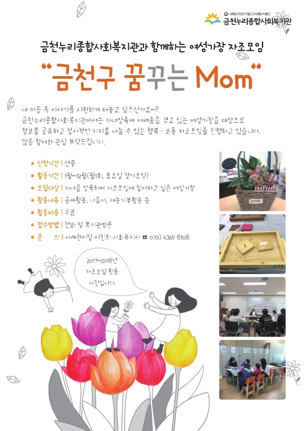 2019년 2월의 금천누리종합사회복지관 2019-02-07 관련링크 본문 금천누리종합사회복지관 2019년 2월 소식입니다. 노인사회활동지원사업 모집과 금천누리복지관 여성가장자조모임 금천Mom 참여자 모집 소식을 소개합니다. 2월 복지관 소식 및 동네 이야기에 많은 관심 가져주시길 바랍니다. * 현재 페이지에서 월홍보지 글씨가 깨져보일 시에, 첨부파일을 참고하여 읽어주시면 감사하겠습니다.^^ 이전글 다음글 수정 삭제 목록