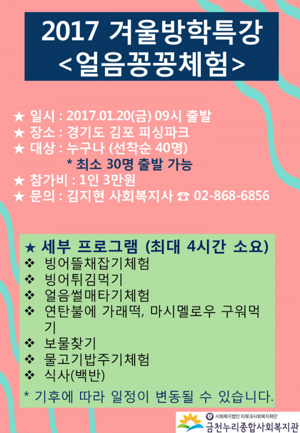 공지사항 프로그램 안내 이야기로 만나는 우리동네 영상으로 만나는 우리동네 미디어로 만나는 우리동네 사회복지사가 소개하는 우리동네 프로그램 안내 금천누리종합사회복지관에서 진행하는 다양한 프로그램을 안내해드립니다. 2017년 겨울방학특강 <얼음꽁꽁체험> 안내 2016-12-09 관련링크 본문 이전글 다음글 수정 삭제 목록 2025년 하반기 2025년 상반기 2024년 하반기 2024년 상반기 2023년 하반기 X 개인정보처리방침 금천누리종합사회복지관 개인정보취급방침 금천누리종합사회복지관(이하 “복지관”이라 함)이 취급하는 모든 개인정보는 관련법령에 근거하거나 정보주체의 동의에 의하여 수집 · 보유와 처리되고 있습니다. 복지관 개인정보처리방침은 「개인정보 보호법」 에 근거를 두고 있으며, 이러한 법령의 규정에 따라 수집 · 보유와 처리하는 개인정보를 공공업무의 적절한 수행과 국민의 권익을 보호하기 위해 적법하고 적정하게 취급할 것입니다. 또한, 복지관은 관련 법령에서 규정한 바에 따라 보유하고 있는 개인정보에 대한 열람청구권과 정정청구권 등 여러분의 권익을 존중하며, 이와 관련한 고충을 신속하고 원활하게 처리할 수 있도록 하기 위하여 다음과 같이 개인정보처리방침을 수립 · 공개합니다. 제1조(개인정보의 처리목적) 복지관은 다음의 목적을 위하여 개인정보를 처리합니다. 처리하고 있는 개인정보는 다음의 목적 이외의 용도로는 이용되지 않으며, 이용목적이 변경될 경우에는 개인정보보호법 제18조에 따라 별도의 동의를 받는 등 필요한 조치를 이행할 예정입니다. 1. 자원봉사 신청 및 자원봉사자 관리 자원봉사 의사 확인, 봉사활동 실시를 위한 자원봉사자의 교육, 사회복지봉사활동인증관리시스템(VMS) 실적입력, 배치신청, 증명서 발급, 소식지 발송, 만 14세 미만 아동의 개인정보 수집 이용 시 법정대리인의 동의여부 확인, 각종 고지·통지, 고충처리, 통계자료 작성 등을 목적으로 개인정보를 처리합니다. 2. 후원 신청 및 후원자 관리 후원과 관련된 기본적인 본인 식별, 기부금 출금, 기부금영수증 발급과 국세청 연말정산간소화서비스로의 정보제공, CMS 신규/해지와 출금요청을 위한 정보제공(금융결제원), 만 14세 미만 아동의 개인정보 수집 이용 시 법정대리인의 동의여부 확인, 각종 고지·통지, 고충처리, 통계자료 작성 등을 목적으로 개인정보를 처리합니다. 3. 시설대관 및 기관방문 업무 운영과 관리 등을 목적으로 개인정보를 처리합니다. 제2조(개인정보의 처리와 보유기간) ① 복지관 법령에 따른 개인정보 보유 · 이용기간 또는 정보주체로부터 개인정보를 수집 시에 동의 받은 개인정보 보유 · 이용기간 내에서 개인정보를 처리 · 보유합니다. ② 통신비밀보호법 제15조의 2(전기통신사업자의 협조의무)에 따른 통신사실 확인자료 보관 - 가입자 전기통신일시, 개시 · 종료시간, 상대방 가입자번호, 사용도수, 발신기지국 위치추적자료 : 12개월 - 컴퓨터통신, 인터넷 로그기록자료, 접속지 추적자료 : 3개월 제3조(개인정보의 제3자 제공) ① 복지관은 정보주체의 개인정보를 제1조(개인정보의 처리 목적)에서 명시한 범위 내에서만 처리하며, 정보주체의 동의, 법률의 특별한 규정 등 개인정보 보호법 제17조에 해당하는 경우에만 개인정보를 제3자에게 제공합니다. ② 복지관은 정보주체로부터 개인정보를 수집 시에 동의 받은 내용 내에서 개인정보를 제3자에게 제공합니다. 제4조(정보주체의 권리 · 의무와 행사방법) ① 정보주체는 복지관에 대해 언제든지 다음 각 호의 개인정보보호 관련 권리를 행사할 수 있습니다. 1. 개인정보 열람요구 2. 오류 등이 있을 경우 정정 요구 3. 삭제요구 4. 처리정지 요구 ② 제1항에 따른 권리 행사는 복지관에 대해 서면, 전화, 전자우편, 모사전송(FAX)등을 통하여 하실 수 있으며 복지관은 이에 대해 지체 없이 조치하겠습니다. ③ 정보주체가 개인정보의 오류 등에 대한 정정 또는 삭제를 요구한 경우에는 복지관은 정정 또는 삭제를 완료할 때까지 당해 개인정보를 이용하거나 제공하지 않습니다. ④ 제1항에 따른 권리 행사는 정보주체의 법정대리인이나 위임을 받은 자 등 대리인을 통하여 하실 수 있습니다. 이 경우 개인정보 보호법 시행규칙 별지 제11호 서식에 따른 위임장을 제출하셔야 합니다. ⑤ 정보주체는 개인정보 보호법 등 관계법령을 위반하여 복지관이 처리하고 있는 정보주체 본인이나 타인의 개인정보와 사생활을 침해하여서는 아니됩니다. 제5조(처리하는 개인정보 항목) ① 복지관은 다음의 개인정보 항목을 처리하고 있습니다. * 필수정보: 이름, 생년월일, 연락처, 주소, 소속, 후원금액, 후원계좌 ② 인터넷 서비스 이용과정에서 아래 개인정보 항목이 자동으로 생성되어 수집될 수 있습니다. - IP주소, 쿠키, MAC주소, 서비스 이용기록, 방문기록, 불량 이용기록 등 제6조(개인정보의 파기) ① 복지관은 개인정보 보유기간의 경과, 처리목적 달성 등 개인정보가 불필요하게 되었을 때에는 지체 없이 해당 개인정보를 파기합니다. 제7조(개인정보의 안전성 확보조치) 복지관은 개인정보의 안전성 확보를 위해 다