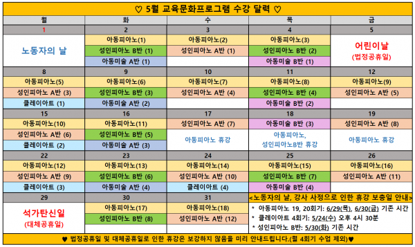 * 5월은 공휴일, 휴관일로 인하여 수업일정에 변동사항이 많습니다. 수강달력 일정에 꼭 참고하시어 혼란이 없으시기 바랍니다.