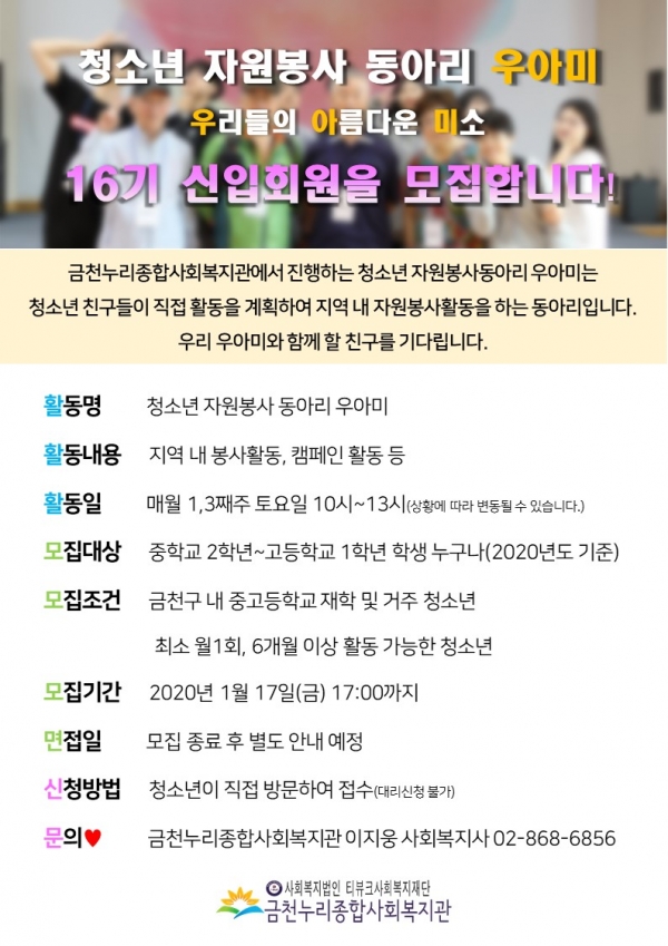 청소년자원봉사동아리 '우아미(우리들의 아름다운 미소)' 16기 신입회원을 모집합니다.
