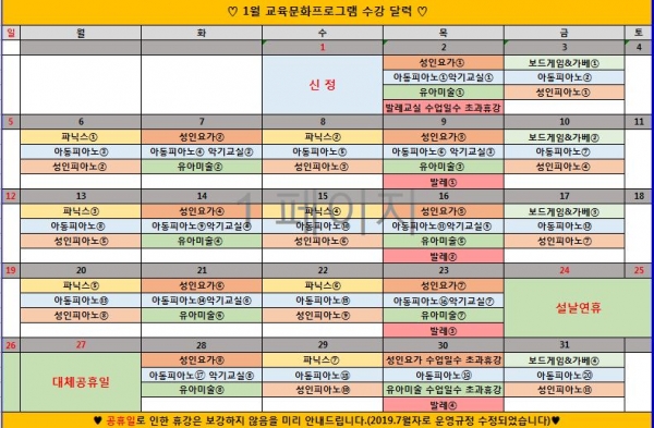 2020년 1월 교육문화프로그램 수강달력 2020-01-07 관련링크 본문 2020년 1월 교육문화 수강달력입니다 ^^ 참고하시고 수업에 참여하세요 ♥ 이전글 다음글 수정 삭제 목록
