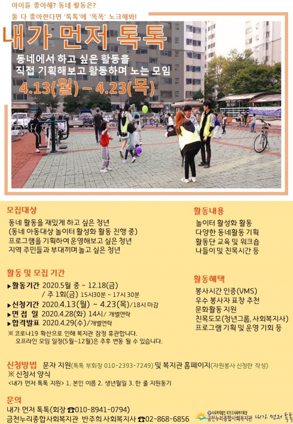 <내가 먼저 톡톡>은 금천구 지역에서 재밌고 자유롭게 마을활동을 하고자 하는 청년들을 위한 단체입니다.