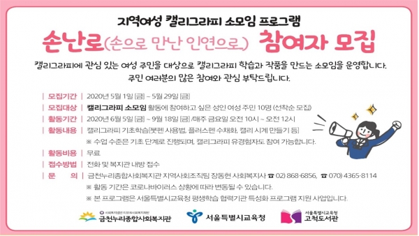 * 모집대상 : 캘리그라피 소모임 활동에 참여하고 싶은 성인 여성 주민 10명 (선착순 모집)