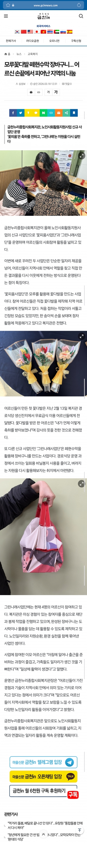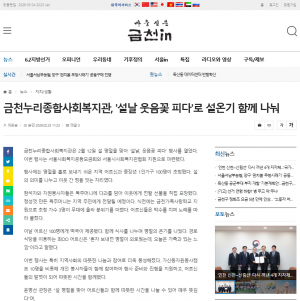 공지사항 프로그램 안내 이야기로 만나는 우리동네 영상으로 만나는 우리동네 미디어로 만나는 우리동네 사회복지사가 소개하는 우리동네 미디어로 만나는 우리동네 미디어를 통해 티뷰크사회복지재단과 금천누리종합사회복지관을 소개합니다. Total 111건 1 페이지 [보도자료](지밸리타임스) 금천누리복지관, 아동·보호자 함께 성장하는 ‘히어로마인드’ 본격… https://www.gvalleytimes.com/news/articleView.html?idxno=4276 작성일2026-03-31 조회수32 [보도자료](한국사회복지연합신문)서울 금천누리종합사회복지관, 2026년 설맞이 ‘설날 웃음… https://www.socialwelfarenews.co.kr/1464 작성일2026-03-31 조회수35 [보도자료](웰페어이슈) 수협은행 가산디지털금융센터, 금천누리복지관 어르신 서예교실에 25… http://www.welfareissue.com/news/articleView.html?idxno=16425 작성일2026-03-31 조회수27 [보도자료](글로벌신문) 수협은행 가산디지털금융센터, 금천누리복지관 어르신 서예교실에 25… https://www.globalnewspaper.co.kr/news/articleView.html?idxno=30318 작성일2026-03-31 조회수39 [보도자료](금천뉴스) 금천누리종합사회복지관, 2026년 설맞이 ‘설날 웃음꽃 피다’ 성황… http://www.gcnews.tv/news/articleView.html?idxno=22650 작성일2026-03-24 조회수49 [보도자료](웰페어이슈) 금천누리종합사회복지관, 노인사회활동지원사업 신규 사업단 ‘꽃피움·… http://www.welfareissue.com/news/articleView.html?idxno=16385 작성일2026-03-24 조회수40 [보도자료](글로벌뉴스) 금천누리종합사회복지관, 노인사회활동지원사업 신규 사업단 ‘꽃피움·… https://www.globalnewspaper.co.kr/news/articleView.html?idxno=30278 작성일2026-03-24 조회수38 [보도자료](금천in) 모루꽃다발·폐현수막 장바구니… 어르신 손끝에서 피어난 지역의 나눔 https://www.gcinnews.com/news/articleView.html?idxno=13817 작성일2026-03-18 조회수60 [보도자료](금천in) 금천누리종합사회복지관, '설날 웃음꽃 피다'로 설온기 함께 나눠 https://www.gcinnews.com/news/articleView.html?idxno=13698 작성일2026-03-05 조회수66 [보도자료](서울자치신문) 한국산업단지공단, 설 맞이 온누리상품권 100만원 후원... 6… https://www.onseoul.net/news/articleView.html?idxno=43727 작성일2026-03-02 조회수42 [보도자료](금천뉴스) 건보공단 금천지사, 설 맞이 ‘하늘반창고 봉사단’ 사회공헌 기부활동… http://www.gcnews.tv/news/articleView.html?idxno=22593 작성일2026-02-24 조회수84 [보도자료](글로벌신문) 서울지성라이온스클럽, 설 맞이 이웃사랑 실천… 금천누리에 300만… https://www.globalnewspaper.co.kr/news/articleView.html?idxno=30133 작성일2026-02-24 조회수76 [보도자료](금천in) 서울지성라이온스클럽, 금천누리에 300만 원 상당 물품 전달... … https://www.gcinnews.com/news/articleView.html?idxno=13682 작성일2026-02-24 조회수73 [보도자료](복지타임스) 한국산업단지공단, 설맞이 온누리상품권 나눔 https://www.bokjitimes.com/news/articleView.html?idxno=42542 작성일2026-02-19 조회수86 [보도자료](금천in) 한국산업단지공단, 설 맞아 온누리상품권 100만 원 후원 https://www.gcinnews.com/news/articleView.html?idxno=13655 작성일2026-02-13 조회수85 열린1페이지 2페이지 3페이지 4페이지 5페이지 다음 맨끝 게시물 검색 검색대상 제목 내용 제목+내용 2025년 하반기 2025년 상반기 2024년 하반기 2024년 상반기 2023년 하반기 X 개인정보처리방침 금천누리종합사회복지관 개인정보취급방침 금천누리종합사회복지관(이하 “복지관”이라 함)이 취급하는 모든 개인정보는 관련법령에 근거하거나 정보주체의 동의에 의하여 수집 · 보유와 처리되고 있습니다. 복지관 개인정보처리방침은 「개인정보 보호법」 에 근거를 두고 있으며, 이러한 법령의 규정에 따라 수집 · 보유와 처리하는 개인정보를 공공업무의 적절한 수행과 국민의 권익을 보호하기 위해 적법하고 적정하게 취급할 것입니다. 또한, 복지관은 관련 법령에서 규정한 바에 따라 보유하고 있는 개인정보에 대한 열람청구권과 정정청구권 등 여러분의 권익을 존중하며, 이와 관련한 고충을 신속하고 원활하게 처리할 수 있도록 하기 위하여 다음과 같이 개인정보처리방침을 수립 · 공개합니다. 제1조(개인정보의 처리목적) 복지관은 다음의 목적을 위하여 개인정보를 처리합니다. 처리하고 있는 개인정보는 다음의 목적 이외의 용도로는 이용되지 않으며, 이용목적이 변경될 경우에는 개인정보보호법 제18조에 따라 별도의 동의를 받는 등 필요한 조치를 이행할 예정입니다. 1. 자원봉사 신청 및 자원봉사자 관리 자원봉사 의사 확인, 봉사활동 실시를 위한 자원봉사자의 교육, 사회복지봉사활동인증관리시스템(VMS) 실적입력, 배치신청, 증명서 발급, 소식지 발송, 만 14세 미만 아동의 개인정보 수집 이용 시 법정대리인의 동의여부 확인, 각종 고지·통지, 고충처리, 통계자료 작성 등을 목적으로 개인정보를 처리합니다. 2. 후원 신청 및 후원자 관리 후원과 관련된 기본적인 본인 식별, 기부금 출금, 기부금영수증 발급과 국세청 연말정산간소화서비스로의 정보제공, CMS 신규/해지와 출금요청을 위한 정보제공(금융결제원), 만 14세 미만 아동의 개인정보 수집 이용 시 법정대리인의 동의여부 확인, 각종 고지·통지, 고충처리, 통계자료 작성 등을 목적으