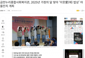 공지사항 프로그램 안내 이야기로 만나는 우리동네 영상으로 만나는 우리동네 미디어로 만나는 우리동네 사회복지사가 소개하는 우리동네 미디어로 만나는 우리동네 미디어를 통해 티뷰크사회복지재단과 금천누리종합사회복지관을 소개합니다. Total 111건 6 페이지 [금천누리](웰페어이슈) 금천누리종합사회복지관, 중장년 1인 가구와 함께하는 '우리동네 지… http://www.welfareissue.com/news/articleView.html?idxno=15615 작성일2025-08-25 조회수264 [금천누리](한국사회복지저널) 금천구 독산4동, 복지관 ‘공간’ 통해 골목에 사람 모였다 https://www.ksw-news.com/news/articleView.html?idxno=3011043 작성일2025-07-30 조회수315 [금천누리](소셜임팩트뉴스) 하얀날개봉사단, 금천누리종합사회복지관 조리실 화구 기부해 https://www.socialimpactnews.net/news/articleView.html?idxno=4257 작성일2025-07-24 조회수307 [금천누리](전기신문) 따뜻한 이웃사랑으로 채워지는 식탁 https://www.electimes.com/news/articleView.html?idxno=358252 작성일2025-07-23 조회수272 [금천누리](소셜임팩트뉴스) 외로운 이웃 없는 금천구 만들기‘이웃ON’연합캠페인 성료 https://www.socialimpactnews.net/news/articleView.html?idxno=4247 작성일2025-07-23 조회수293 [금천누리](마을신문 금천in) 금천구 고립가구 전담기구 연합캠페인‘이웃ON’ 개최 https://www.gcinnews.com/news/articleView.html?idxno=12848 작성일2025-07-21 조회수276 [금천누리](국내매일) 금천구 고립가구 전담기구 연합캠페인‘이웃ON’ 개최 금천구 고립가구 전담기구 연합캠페인‘이웃ON’ 개최 – 국내매일 작성일2025-07-16 조회수283 [금천누리](마을신문 금천in) 금천구, 취약아동 위한 ‘학습환경 개선’ 3자 협약 체결…… https://www.gcinnews.com/news/articleView.html?idxno=12803 작성일2025-07-14 조회수294 [금천누리](에코저널) 금천누리종합사회복지관, 저탄소 생활실천 '그리니지' 진행 (에코저널) https://ecojournal.co.kr/m/view.php?idx=162414 작성일2025-06-30 조회수277 [금천누리](금천뉴스) 금천누리종합사회복지관, 그리니지(Green&Easy)와 함께하는 탄… http://www.gcnews.tv/news/articleView.html?idxno=21501 작성일2025-06-27 조회수253 [금천누리](에코저널) 금천누리종합사회복지관, '그리니지' 참여자 모집 (에코저널) https://www.ecojournal.co.kr/news/view.php?idx=162074 작성일2025-06-18 조회수255 [금천누리](문화일보, 사회복지신문) 금천누리종합사회복지관, 2025년 가정의 달 맞아 ‘… (문화일보) https://www.munhwa.com/article/11504749?ref=naver(사회복지신문) http://www.socialwelfarenews.com/news/view.php?idx=3933&sm=w_total&stx=%EA%B8%88%EC%B2%9C%EB%88%84%EB%A6%AC&stx2=&w_section1=&sdate=&edate= 작성일2025-05-16 조회수285 [금천누리](사회복지신문)금천누리종합사회복지관-㈜효돌, AI돌봄로봇으로 중장년 1인 가구 … http://www.socialwelfarenews.com/news/view.php?idx=3780&sm=w_total&stx=%ED%9A%A8%EB%8F%8C&stx2=&w_section1=&sdate=&edate= 작성일2025-04-16 조회수286 [금천누리](문화일보)금천누리종합사회복지관, ‘곁에 있던 사람들’ 애도 모임 운영 https://www.munhwa.com/news/view.html?no=2025041001039927107012 작성일2025-04-10 조회수276 [금천누리](웰페어이슈) 지역주민이 함께하는 마을잔치 "추억으로 남기는 5월 이야기" 보도… http://www.welfareissue.com/news/articleView.html?idxno=13914 작성일2024-05-21 조회수395 처음 이전 열린6페이지 7페이지 8페이지 맨끝 게시물 검색 검색대상 제목 내용 제목+내용 2025년 하반기 2025년 상반기 2024년 하반기 2024년 상반기 2023년 하반기 X 개인정보처리방침 금천누리종합사회복지관 개인정보취급방침 금천누리종합사회복지관(이하 “복지관”이라 함)이 취급하는 모든 개인정보는 관련법령에 근거하거나 정보주체의 동의에 의하여 수집 · 보유와 처리되고 있습니다. 복지관 개인정보처리방침은 「개인정보 보호법」 에 근거를 두고 있으며, 이러한 법령의 규정에 따라 수집 · 보유와 처리하는 개인정보를 공공업무의 적절한 수행과 국민의 권익을 보호하기 위해 적법하고 적정하게 취급할 것입니다. 또한, 복지관은 관련 법령에서 규정한 바에 따라 보유하고 있는 개인정보에 대한 열람청구권과 정정청구권 등 여러분의 권익을 존중하며, 이와 관련한 고충을 신속하고 원활하게 처리할 수 있도록 하기 위하여 다음과 같이 개인정보처리방침을 수립 · 공개합니다. 제1조(개인정보의 처리목적) 복지관은 다음의 목적을 위하여 개인정보를 처리합니다. 처리하고 있는 개인정보는 다음의 목적 이외의 용도로는 이용되지 않으며, 이용목적이 변경될 경우에는 개인정보보호법 제18조에 따라 별도의 동의를 받는 등 필요한 조치를 이행할 예정입니다. 1. 자원봉사 신청 및 자원봉사자 관리 자원봉사 의사 확인, 봉사활동 실시를 위한 자원봉사자의 교육, 사회복지봉사활동인증관리시스템(VMS) 실적입력, 배치신청, 증명서 발급, 소식지 발송, 만 14세 미만 아동의 개인정보 수집 이용 시 법정대리인의 동의여부 확인, 각종 고지·통지, 고충처리, 통계자료 작성 등을 목적으로 개인정보를 처리합니다. 2. 후원 신청 및 후원자 관리 후원과 관련된 기본적인 본인 식별, 기부금 출금, 기부금영수증 발급과 국세청 연말정산간소화서비스로의 정보제공, CMS 신규/해지와 출금요청을 위한 정보제공(금융결제